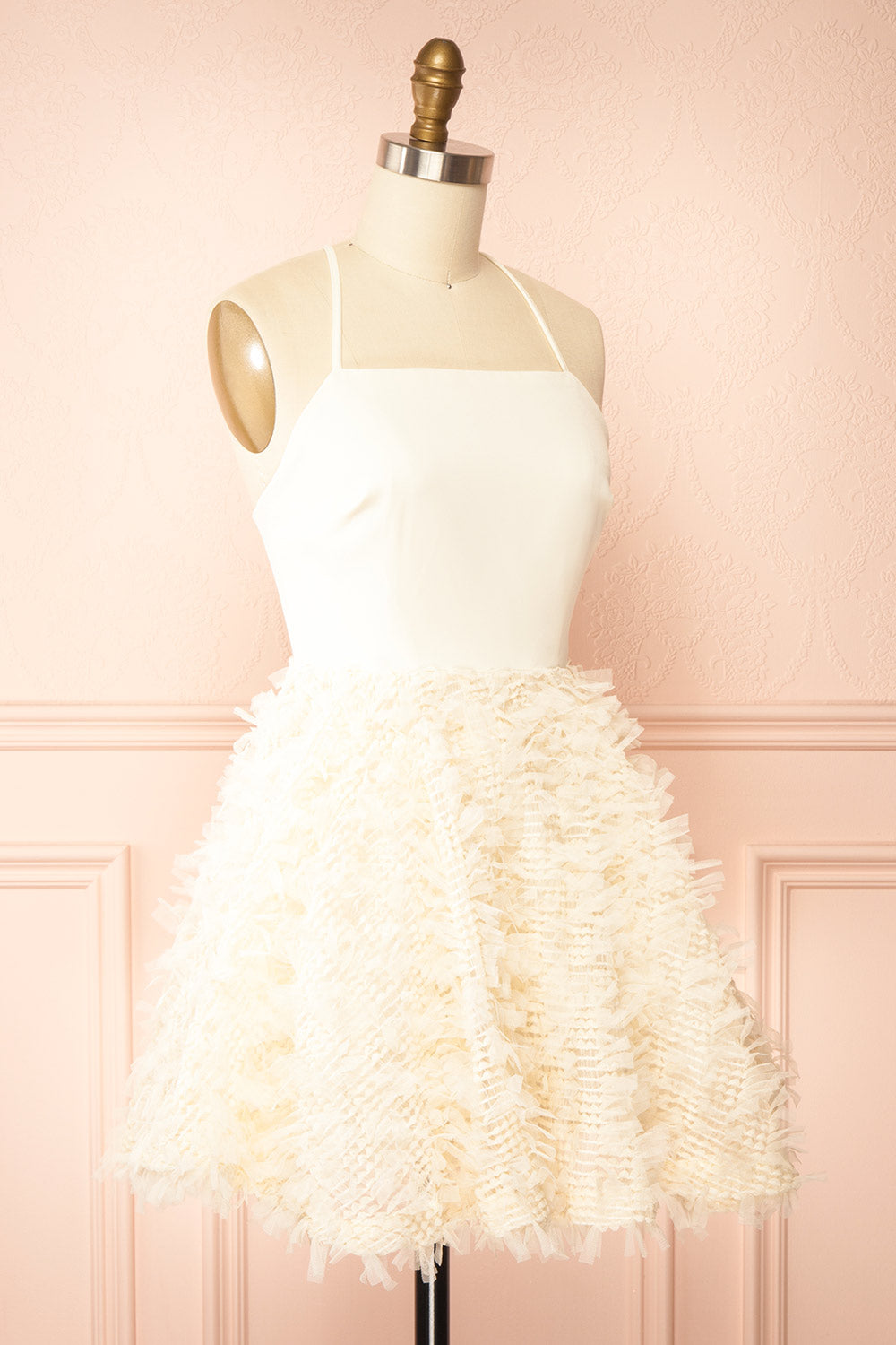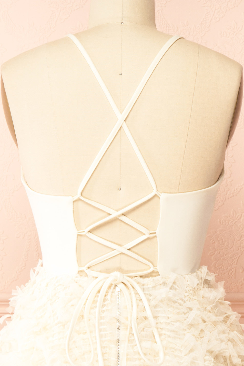 Elevate your evening elegance with this stunning short ivory dress! Made from a smooth woven fabric, the fitted bodice features a beautiful open corset back and adjustable straps for the perfect fit. The enchanting mesh ruched skirt, adorned with playful mesh fringe ribbon, adds a touch of whimsy and sophistication. Whether you're celebrating a cocktail party or an engagement, this dress is designed to make you shine!