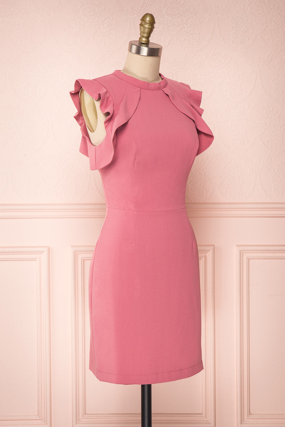 Here's a little dress that sets itself apart with class and romance! The sheath cut is decorated with ruffles and features an open back. The lightweight lining will ensure your comfort, while the back zipper and hook closures at the nape of the neck will let you slip it on in a jiffy!