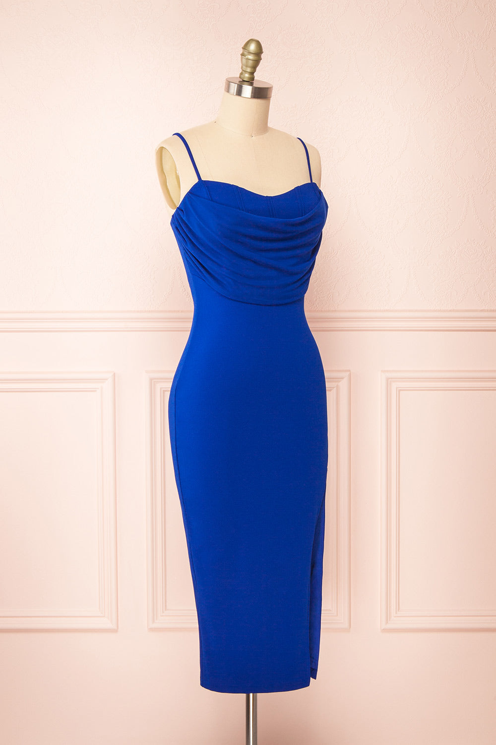 You will look absolutely sublime in this beautiful fitted midi dress! This lovely piece features a cowl neck and a bustier-inspired top that pairs perfectly with the fitted skirt that will wonderfully highlight your figure. The soft elastic fabric as well as the side slit give it a chic and elegant look, suitable for more than one occasion. You can adjust the straps to get the perfect fit!