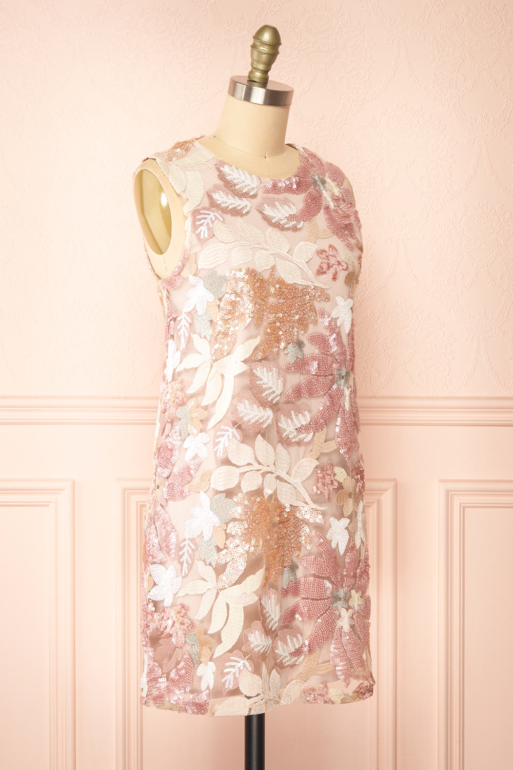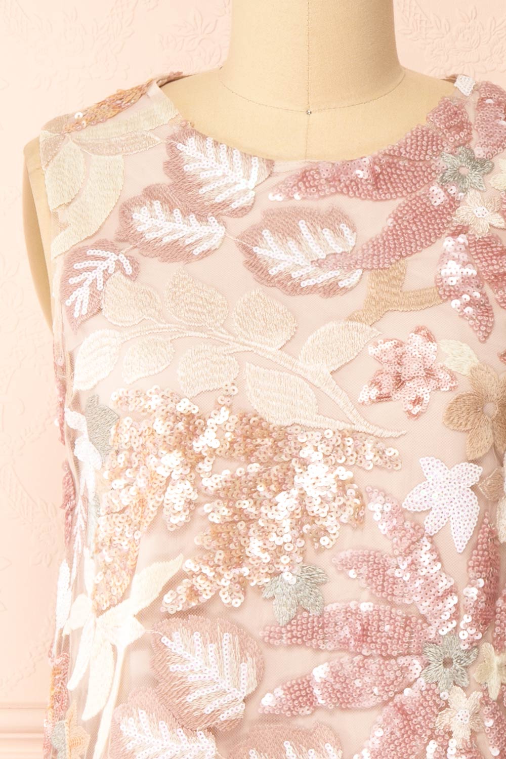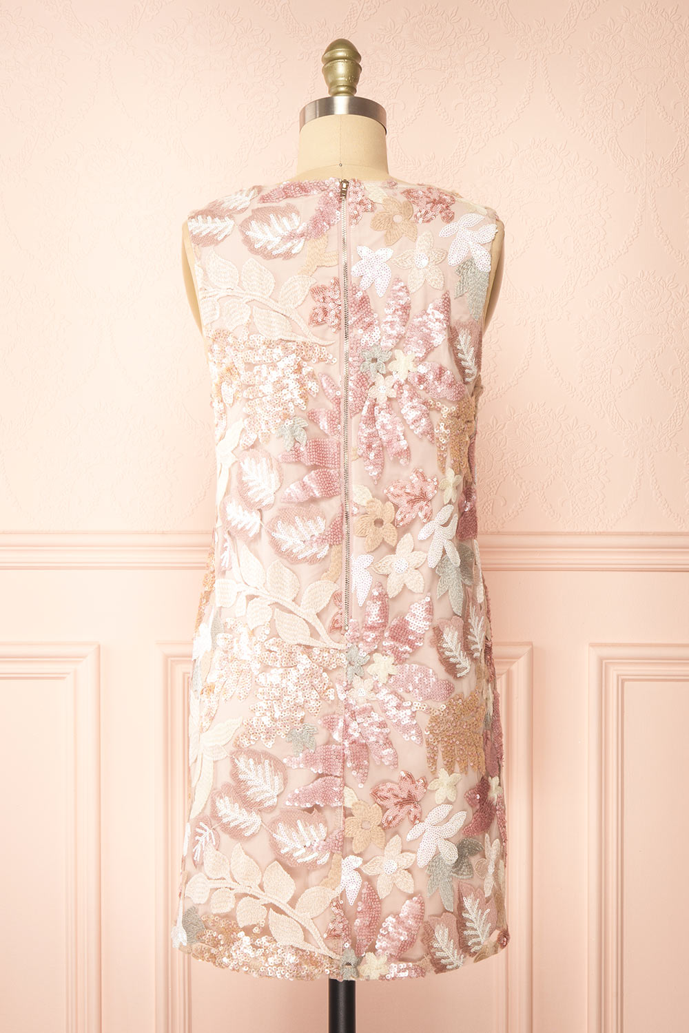 Step into a world of elegance with this enchanting short sequin dress, adorned with delicate embroidered leaves in soft pastel colours. It's straight cut, sleeveless design, and round neckline create a beautifully feminine silhouette that's perfect for special occasions or a night out. Unveil your inner grace and let this dress be a lovely addition to your wardrobe, radiating charm and sophistication with every wear.