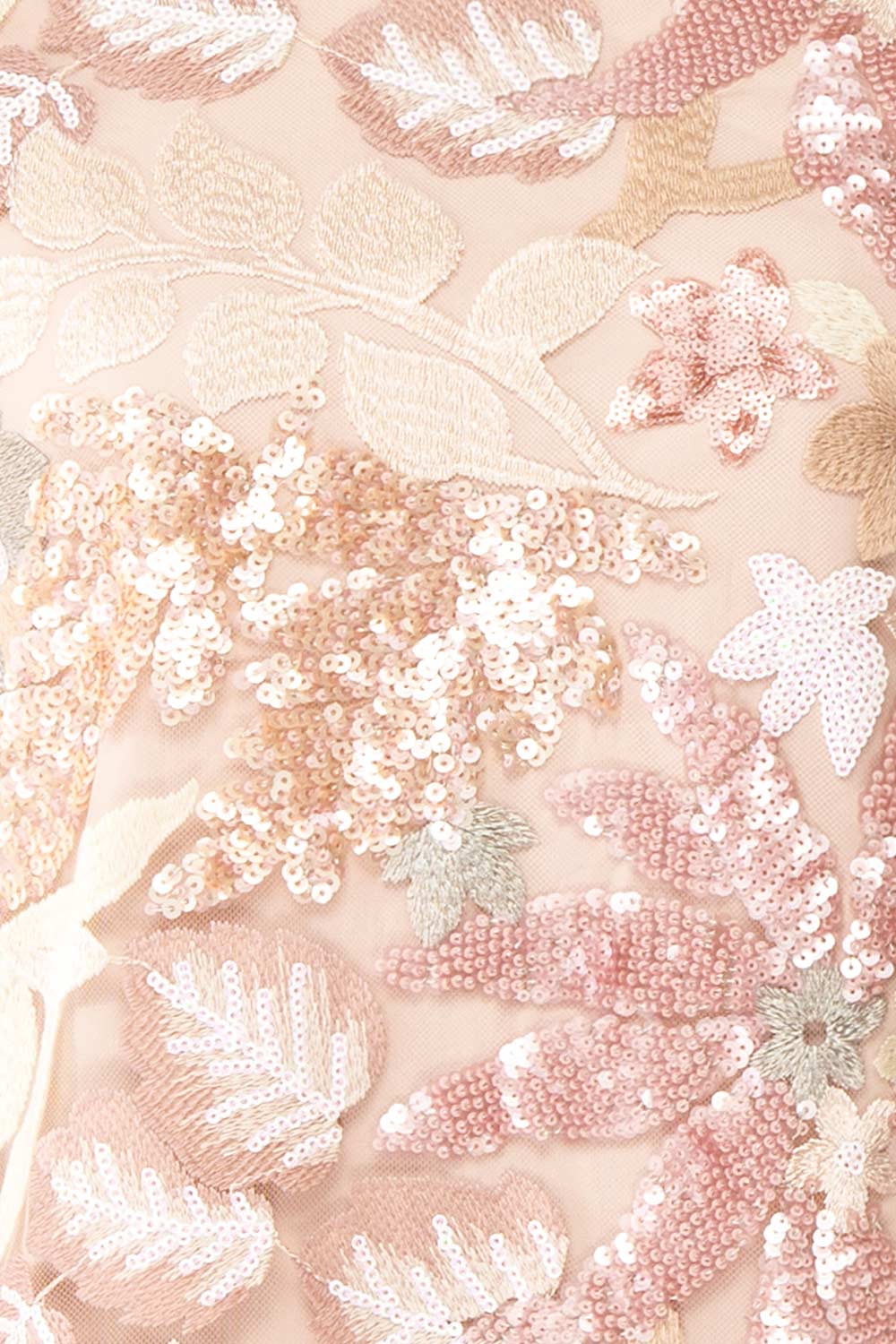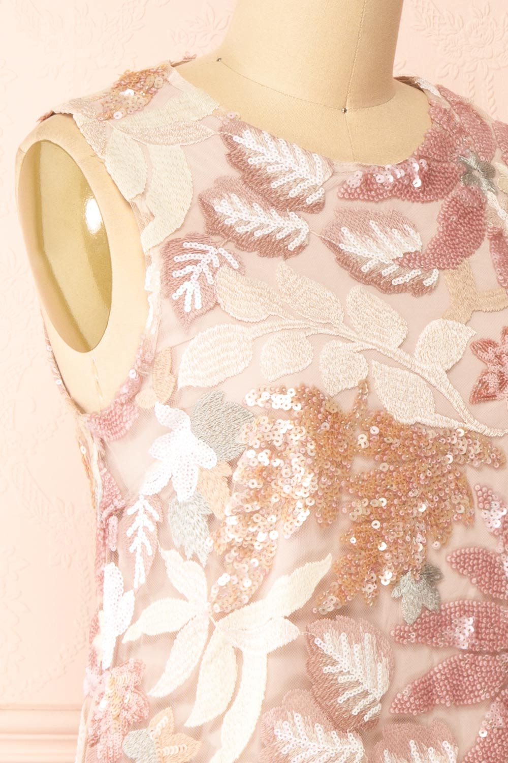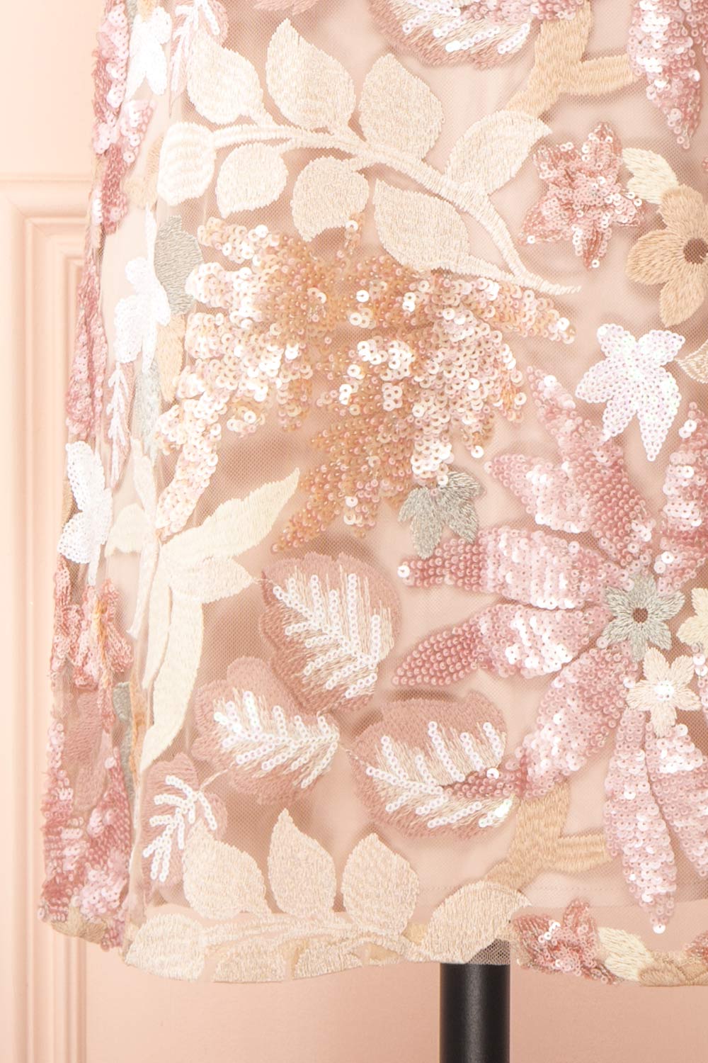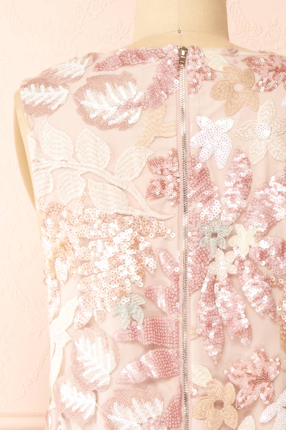 Step into a world of elegance with this enchanting short sequin dress, adorned with delicate embroidered leaves in soft pastel colours. It's straight cut, sleeveless design, and round neckline create a beautifully feminine silhouette that's perfect for special occasions or a night out. Unveil your inner grace and let this dress be a lovely addition to your wardrobe, radiating charm and sophistication with every wear.
