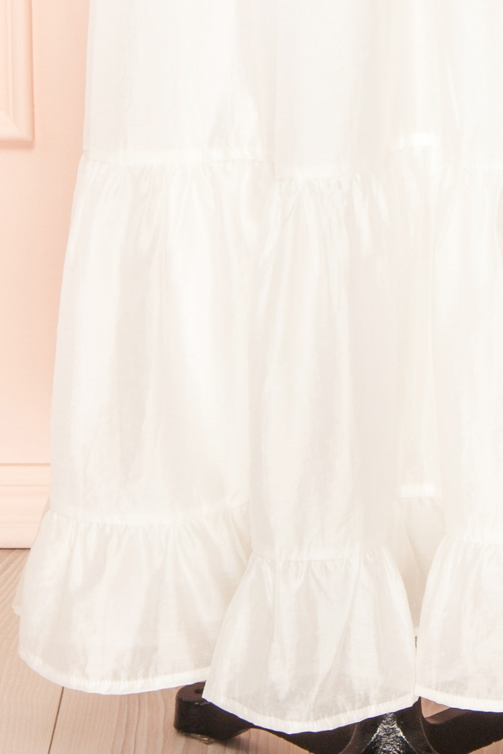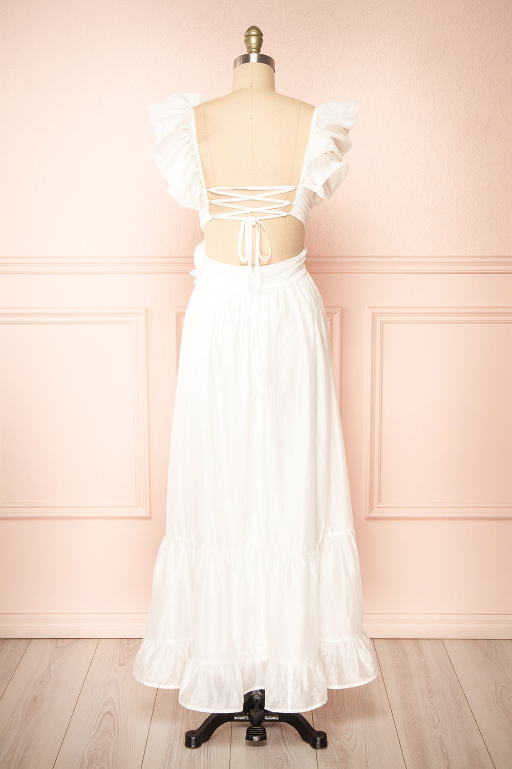 You'll be breathtaking in this magnificent long white dress on your special day! Its plunging neckline is elegantly complemented by its ruffled straps, while its fluid skirt will fall beautifully against your silhouette. You'll appreciate its crossed fabric bands at the waist, as well as its lace-up back that will allow you to adjust it to your figure. The delicate 3D flowers at the bust are an enchanting detail sure to elevate the final look!