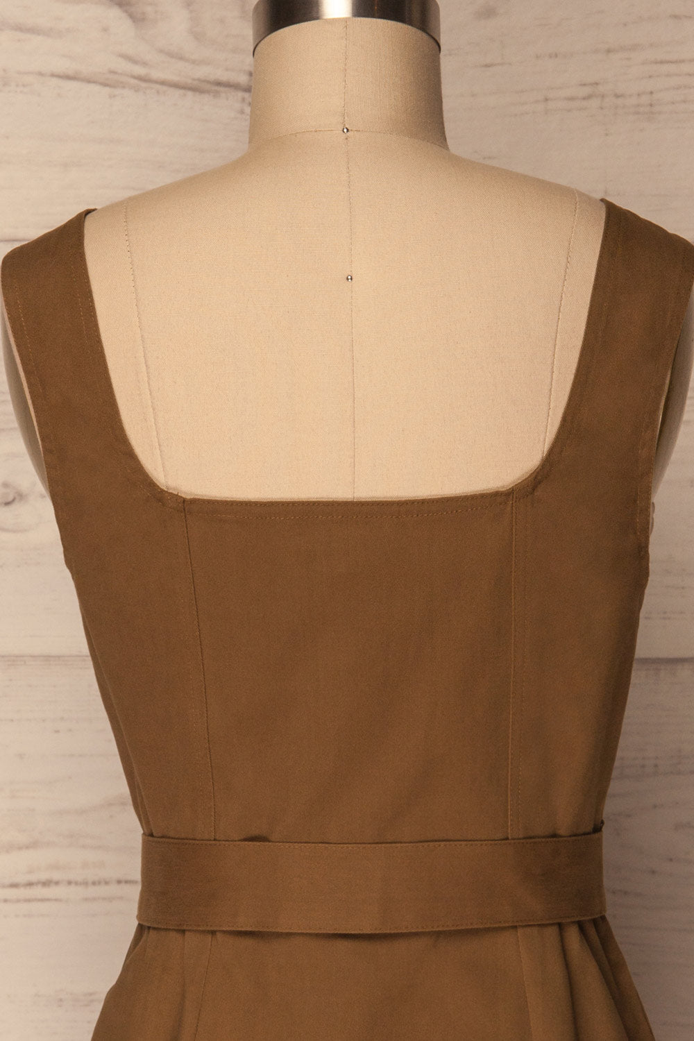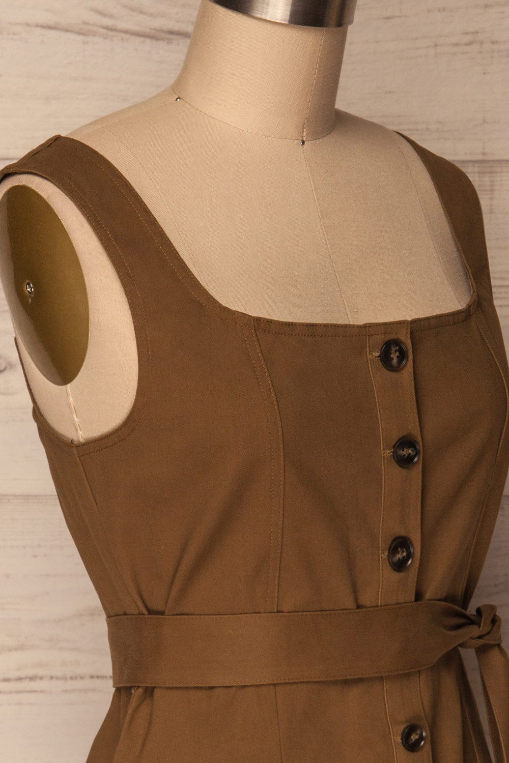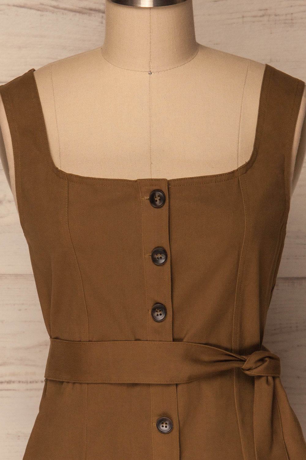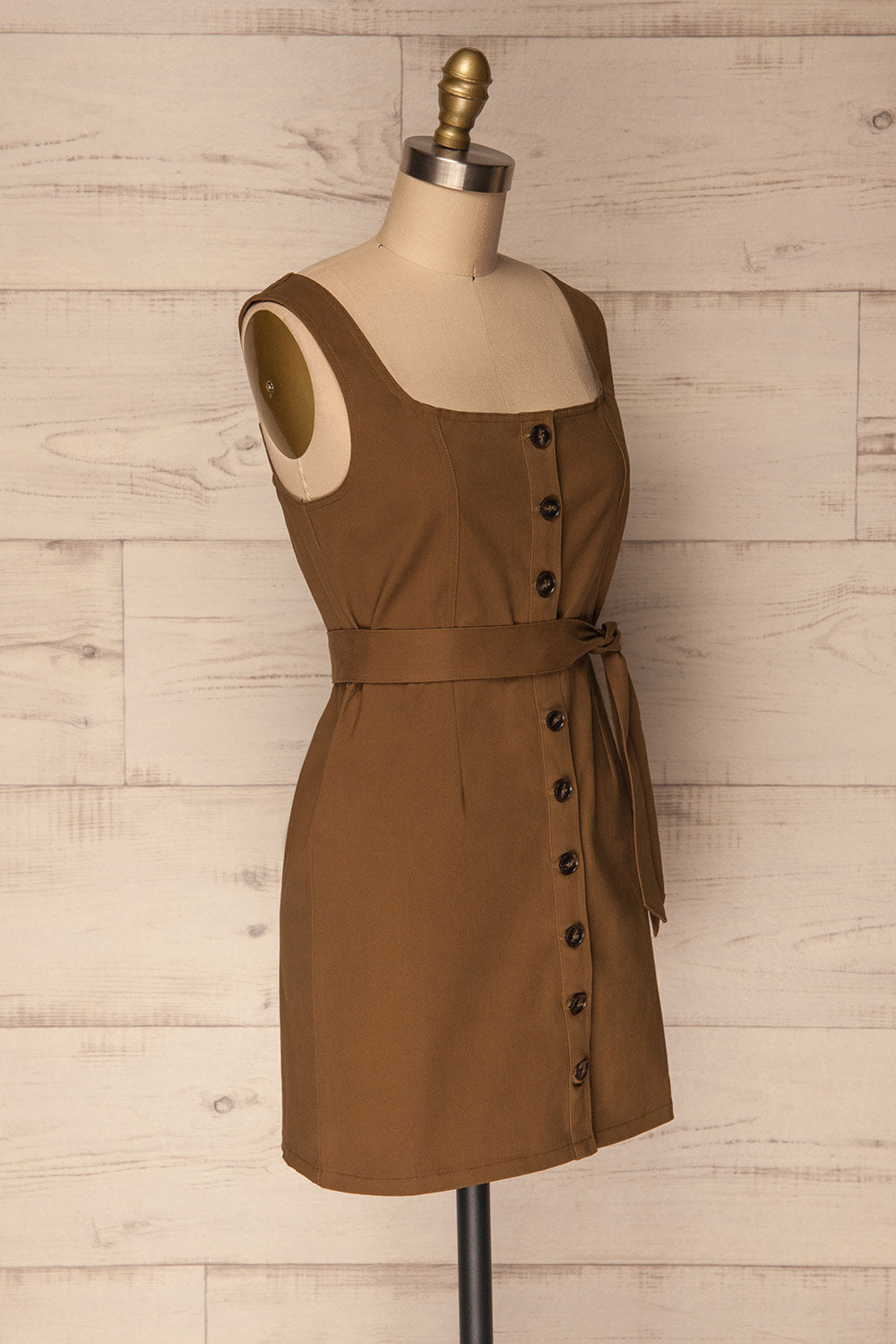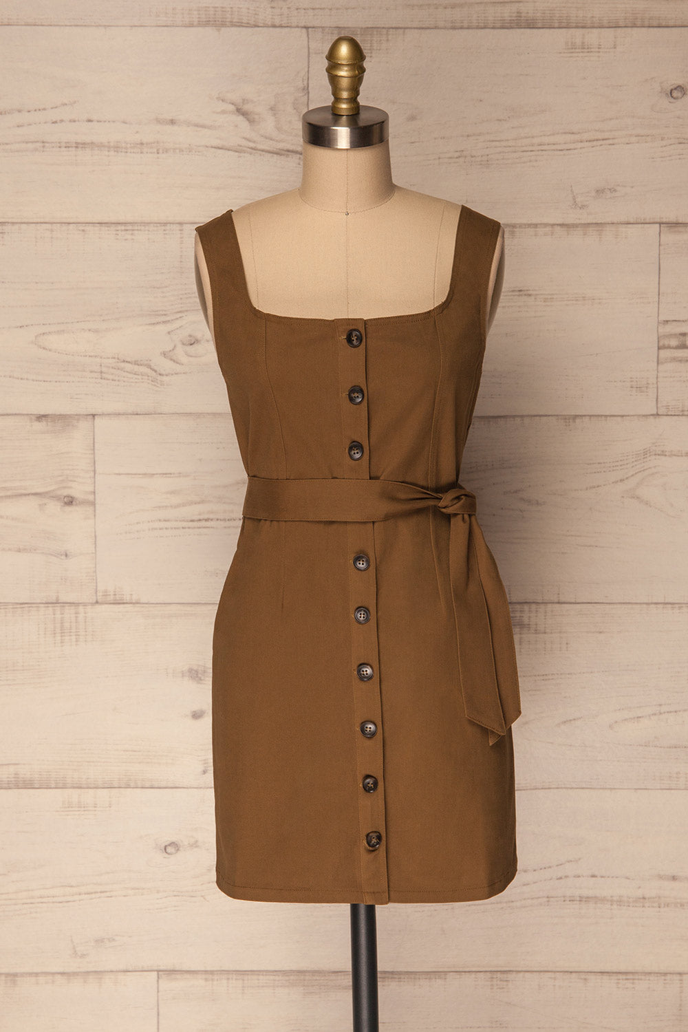 Seize every day's adventure in this little summer dress! Its solid, denim fabric will be comfortable and durable. The buttoned front and the removable fabric belt are practical and add a neat effect to your look.