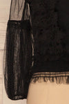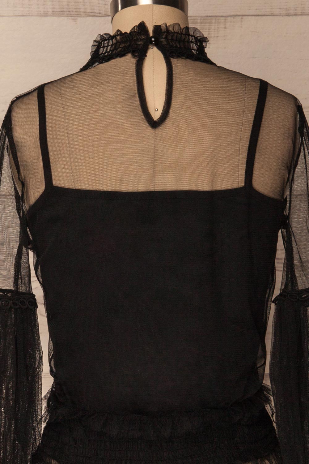 You will be amazed by the charming details of this top! Its lightweight and transparent mesh will reveal your skin, while the puffed sleeves and crocheted lace will add texture and volume to your outfit. You will appreciate the practical elements such as the opaque stretch lining and the buttoned keyhole at the nape of the neck.