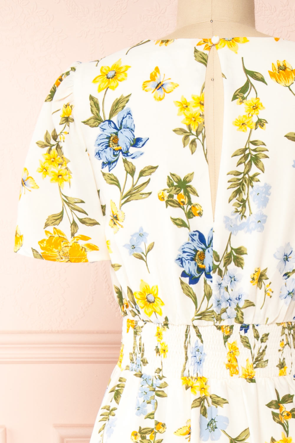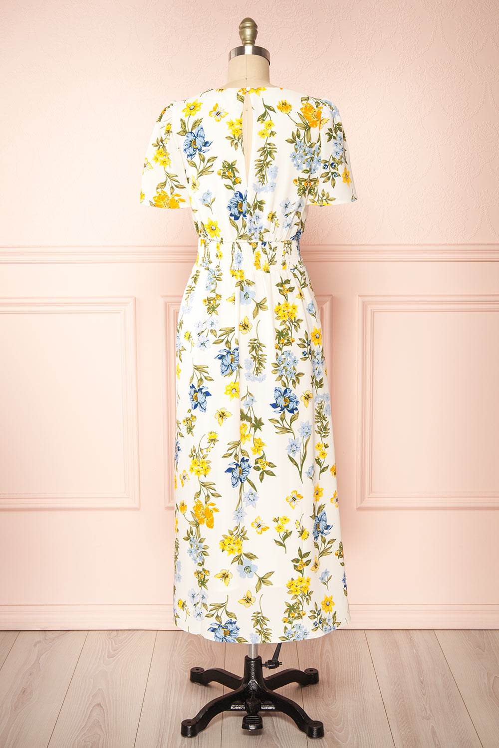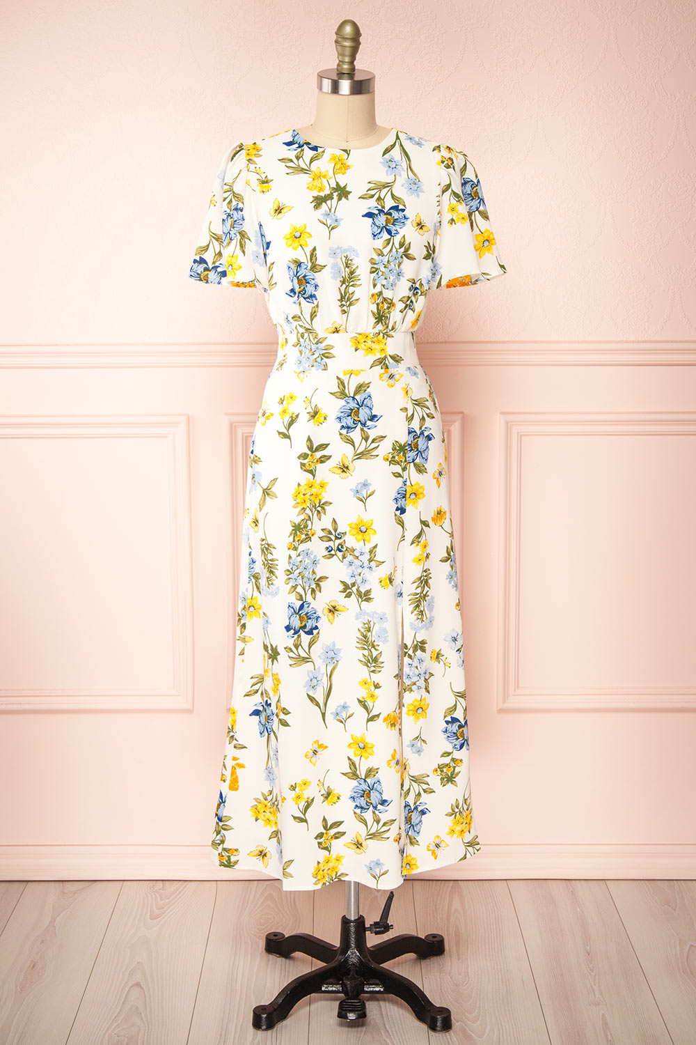 Simple and charming, you will fall in love with this delicate floral midi dress! Its round neckline and short sleeves will give it a casual look, while the front slit adds a playful touch to your outfit. The lightweight fabric will make it comfortable to wear. Thanks to its elastic waistband and back button, it will be easy to put on.