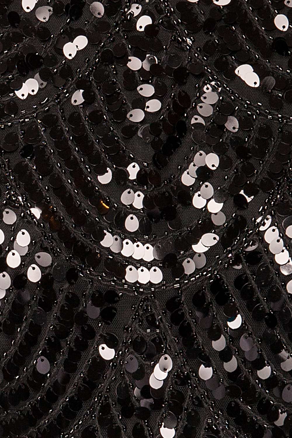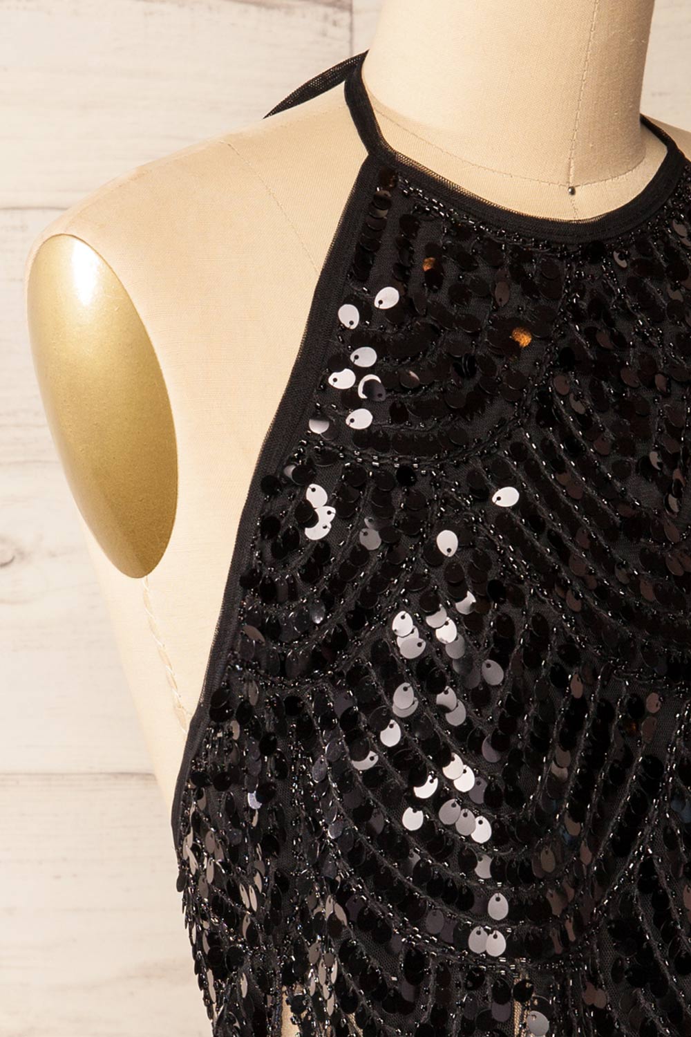 Be the center of attention in this sparkling black sequin halter top. With an eye-catching scalloped pattern, adjustable halter neckline, and open back, it's a dazzling piece that is sure to turn heads. Get ready to shine!
