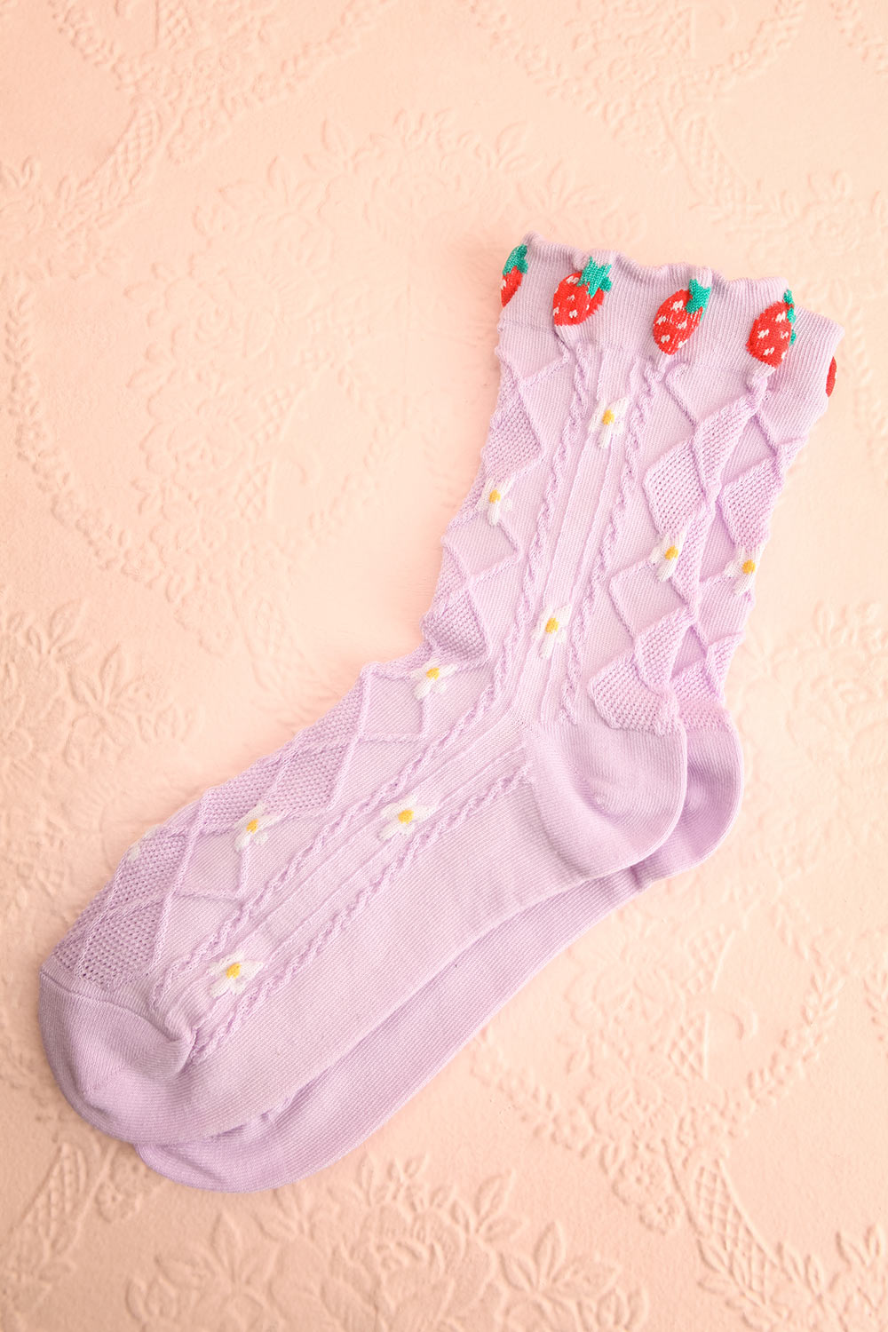 These adorable socks will bring a smile to your face! Their strawberries and daisies print is complemented by a cable knit trim to add a delicate and fun touch to all of your outfits!
