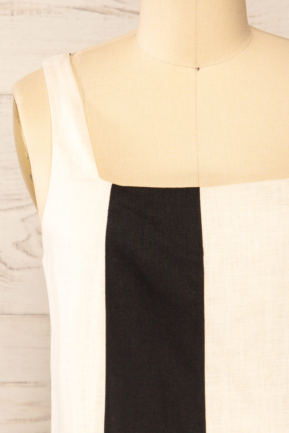 Classic yet eye-catching, this short black and ivory striped dress will add a lovely flair to your wardrobe! Its square neckline and thick straps will wonderfully complement its straight cut. The soft and light linen fabric is sure to keep you comfortable throughout the day, while the bow in the upper back is a lovely detail!
