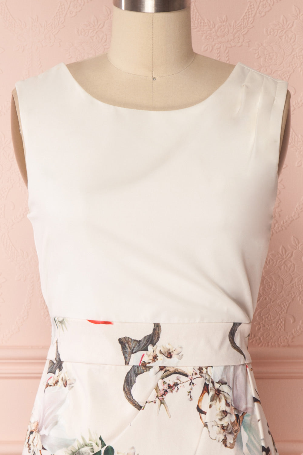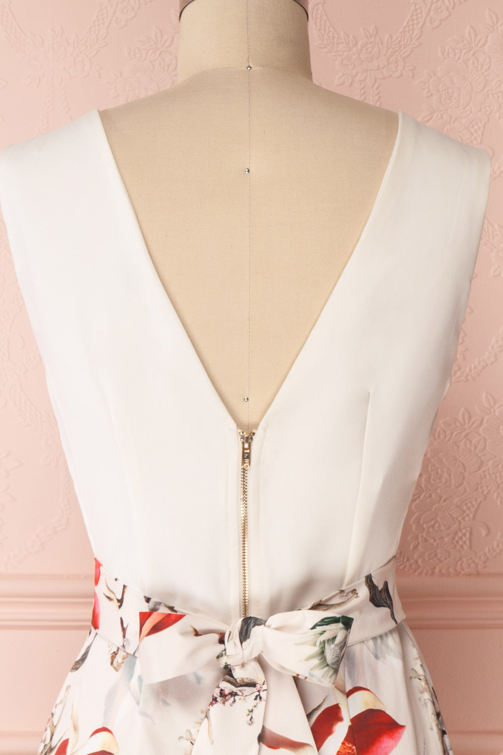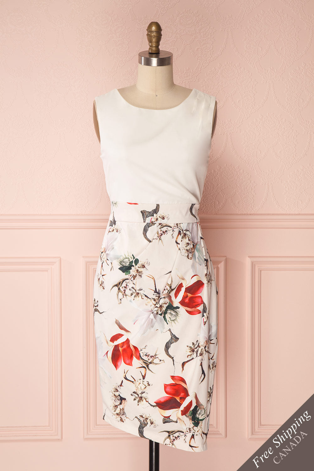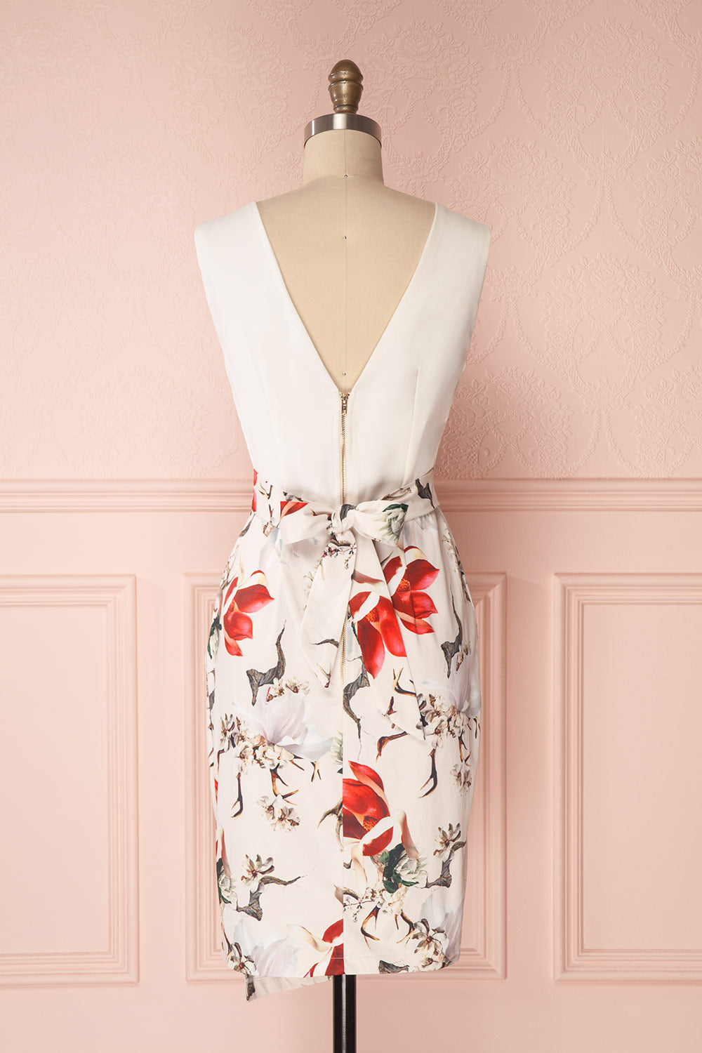 Showcase your refined allure with this spring inspired cocktail dress! The fitted tulip cut features a wrap style slit for a comfort and freedom of movement, proving flattering all the same. The integrated fabric belt will highlight your waist and the golden zipper will be practical.