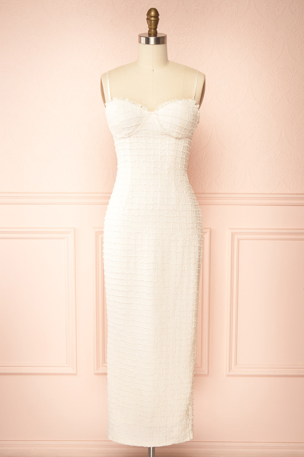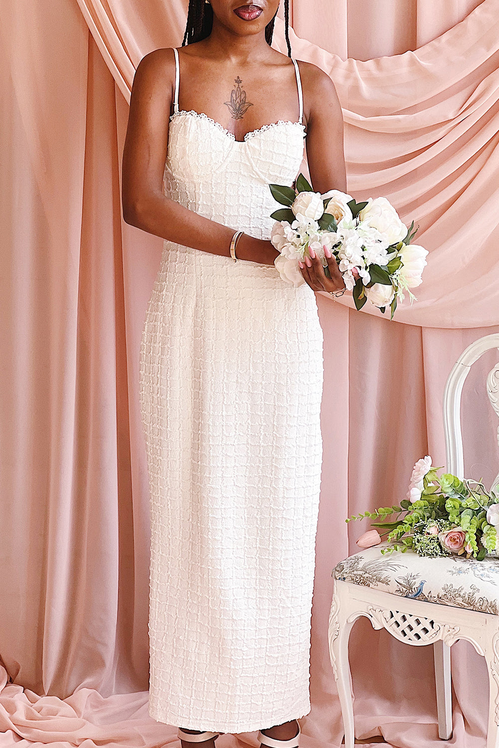 Step into the spotlight with this irresistibly chic long fitted textured dress, designed to accentuate your silhouette with a stunning corset back for a tailored fit! The delicate lace trim at the bust adds a touch of romance, while the thin adjustable straps that are removable and stylish back slit ensure you move with confidence and grace. With a convenient side zipper for easy dressing, this dress is your new go-to for making unforgettable memories!