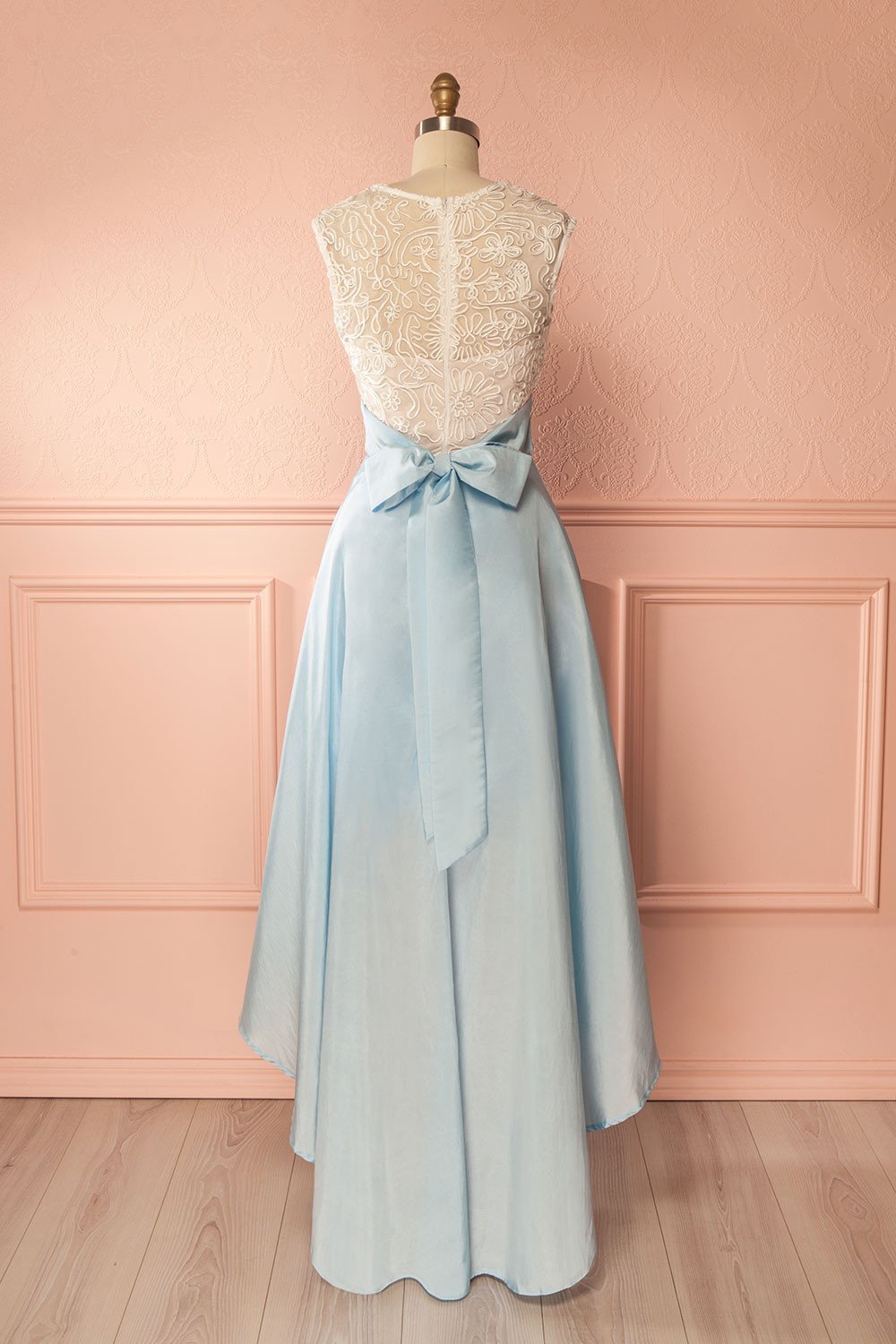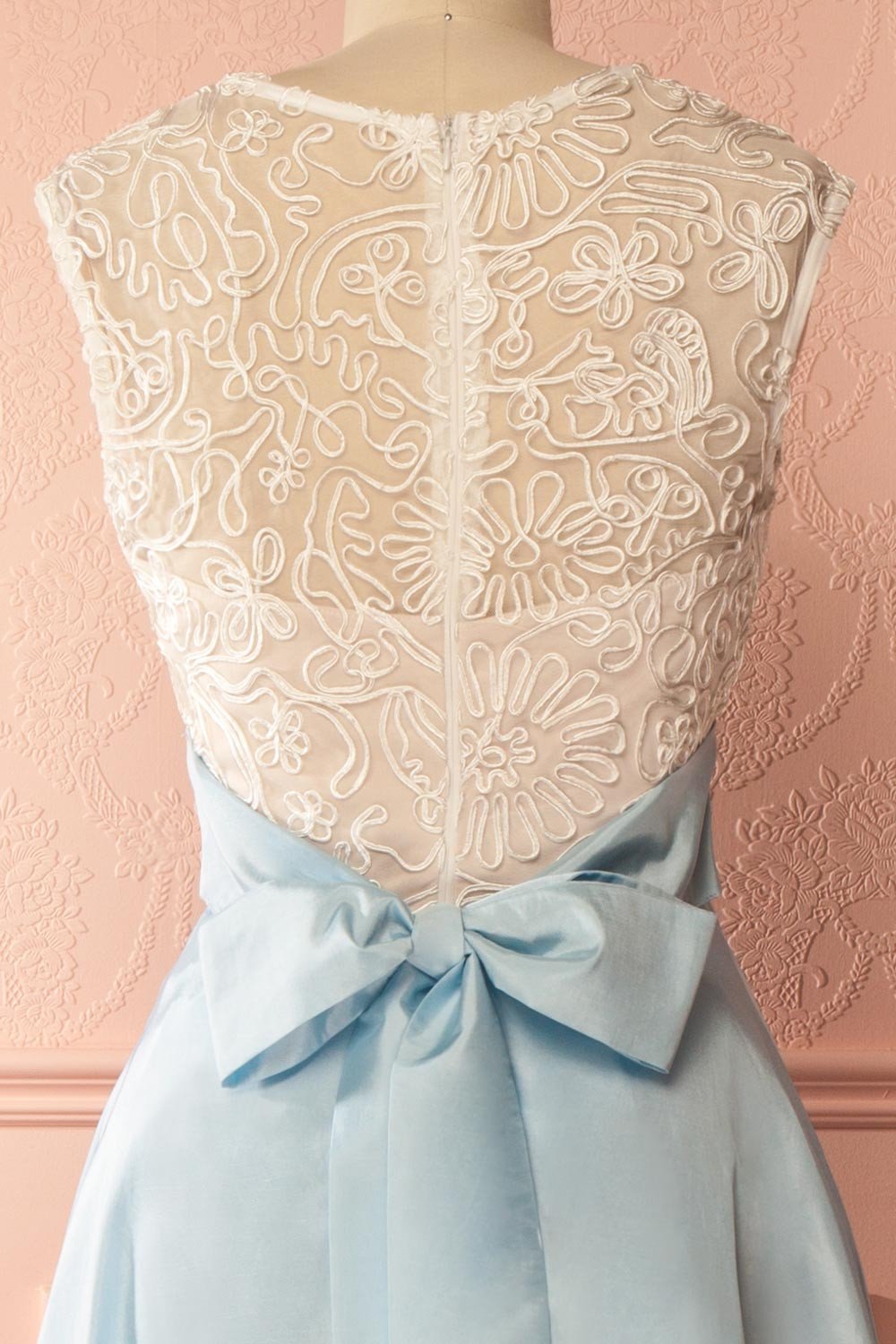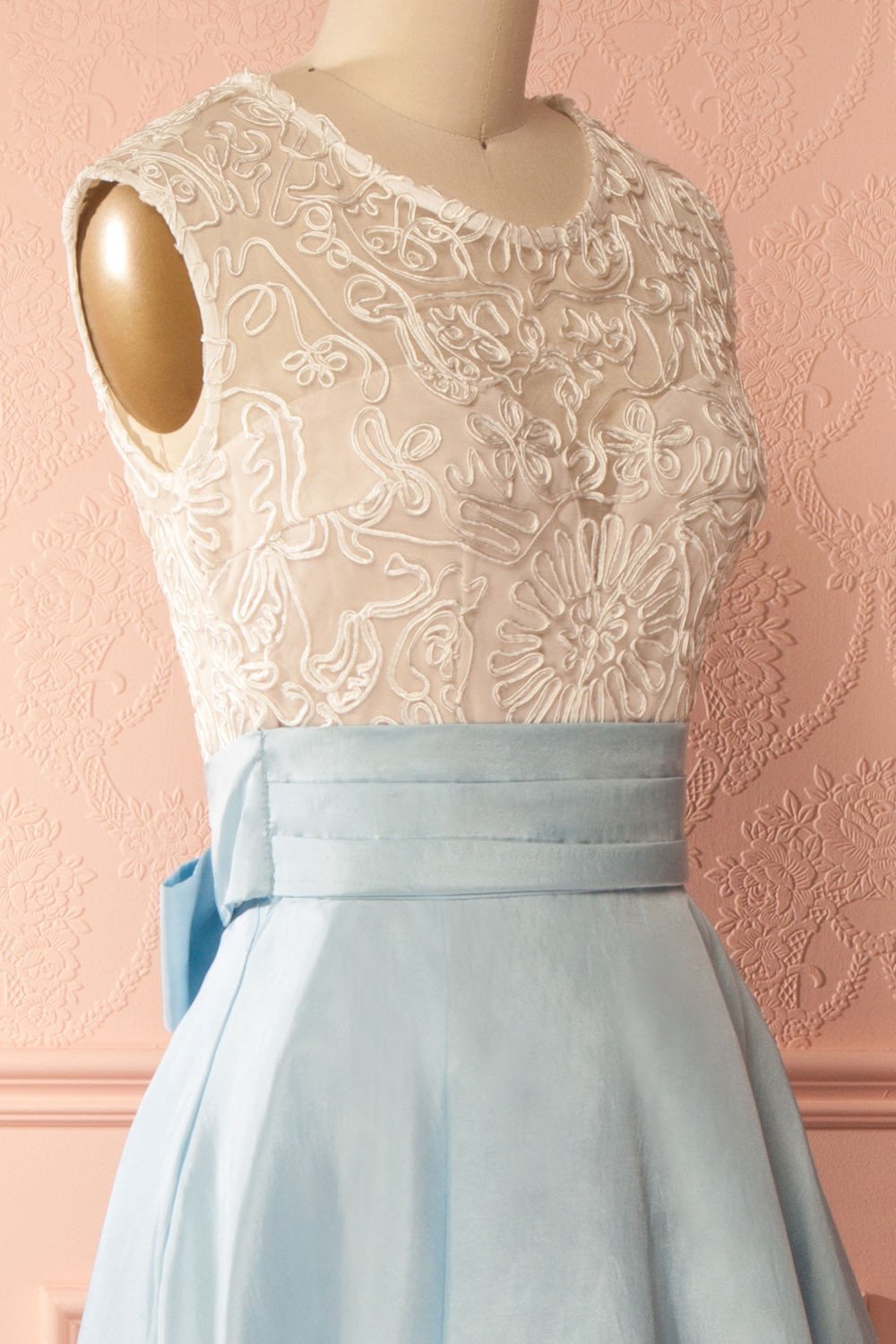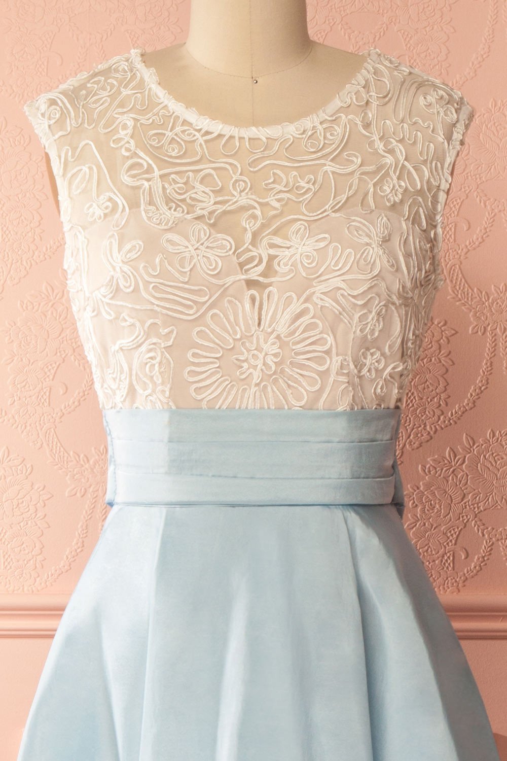 This sumptuous dress will transport you to a universe where delicacy and elegance is ever prominent! Its bodice is decorated with embroidered ribbons and reveals a sweetheart neckline. Your waist will be highlighted thanks to the fabric that ties in the back in a cute bow. The skirts satiny fabric holds its volume thanks to layers of tulle and a stretchy lining underneath. Take advantage of its high-low cut and show-off your favourite pair of heels!