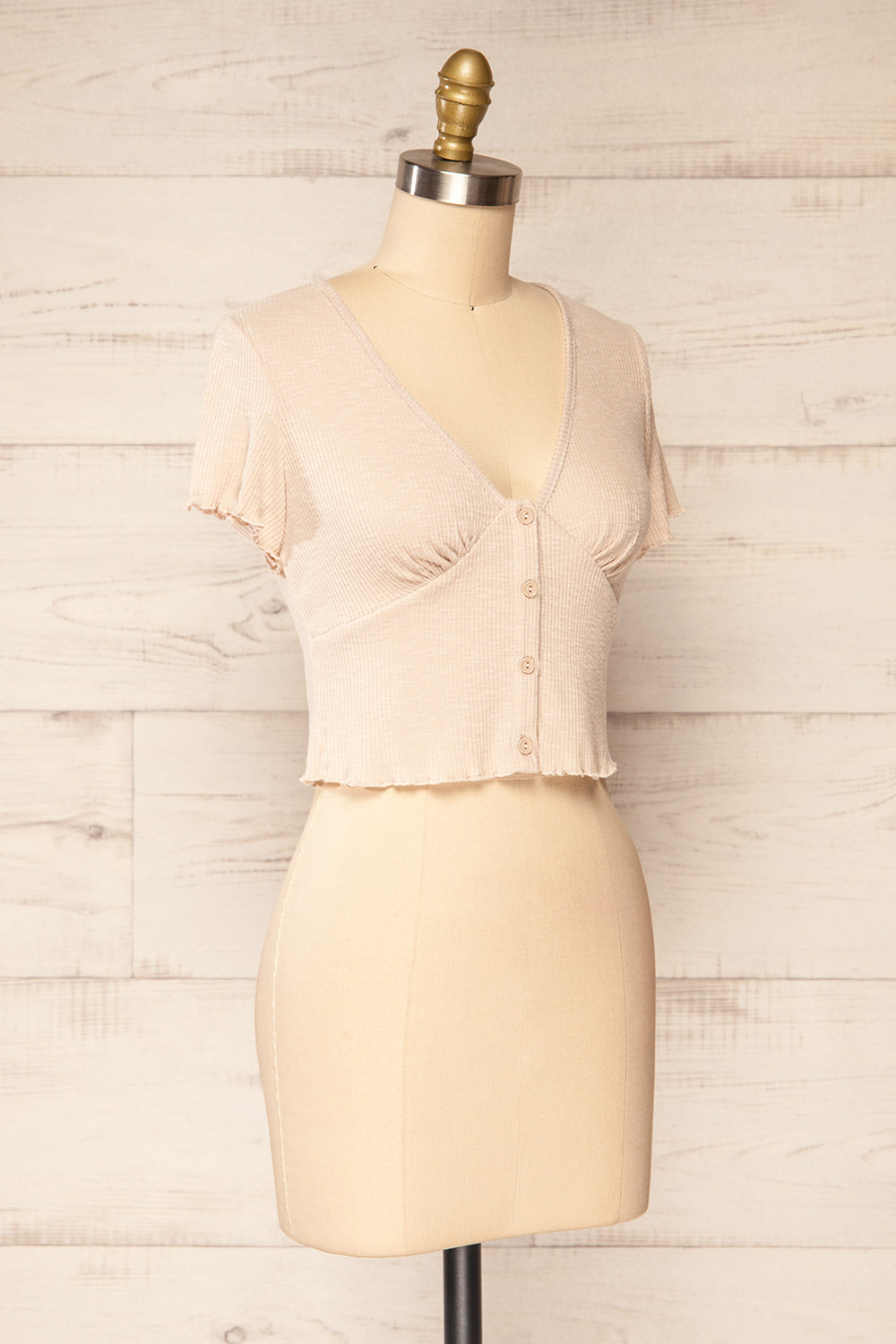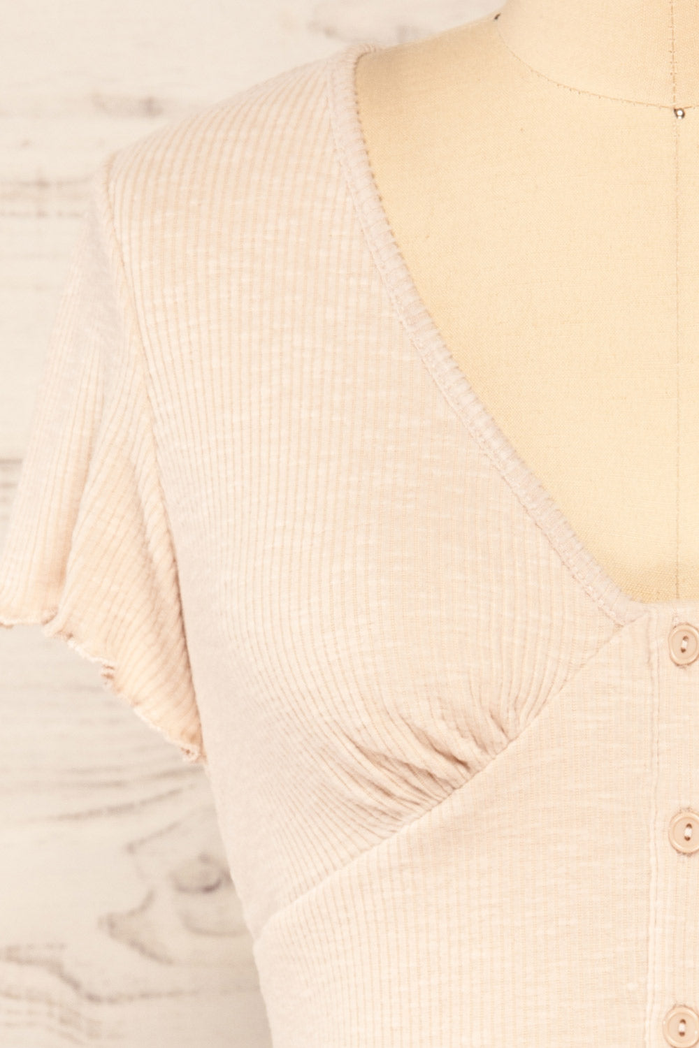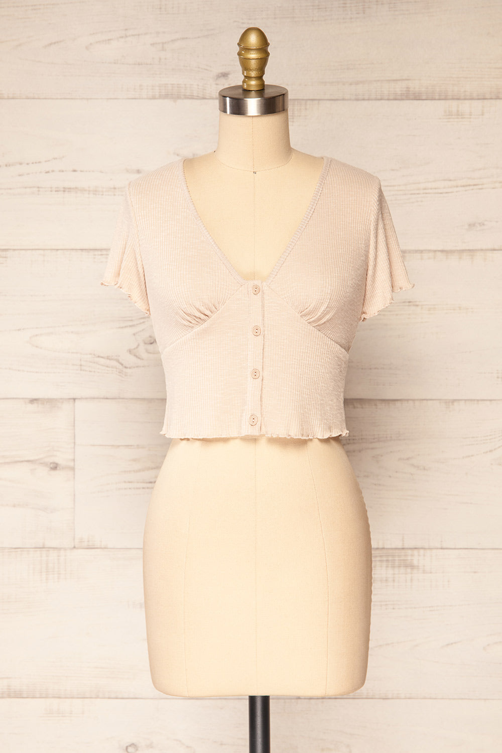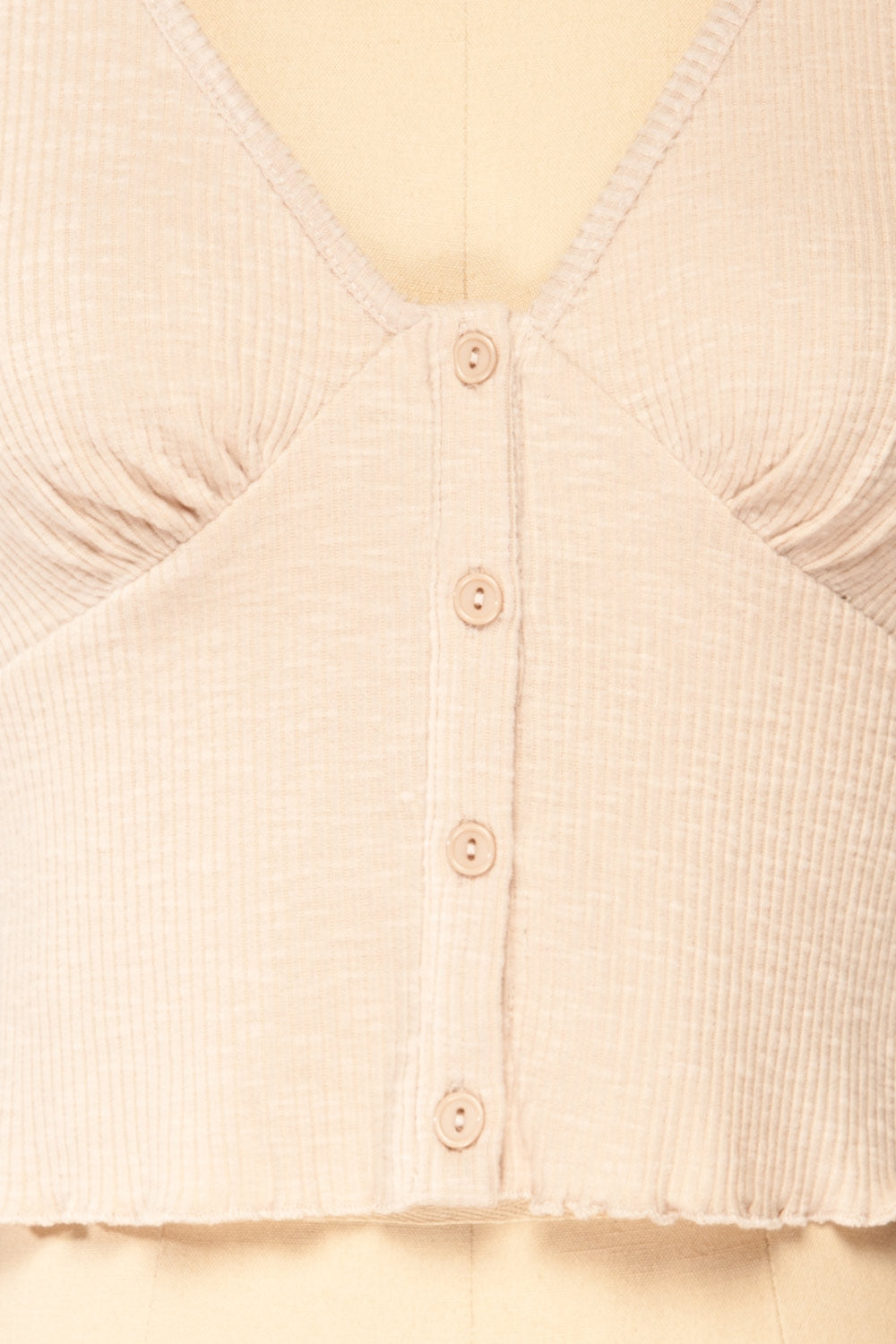 Looking for a cute top to go with all of your daily outfits? This lovely cropped top will answer all of your needs while offering you the most stylish looks. Its small details such as the frills and the front buttons make it a unique piece while its soft ribbed and stretchy fabric will wonderfully complement your figure.