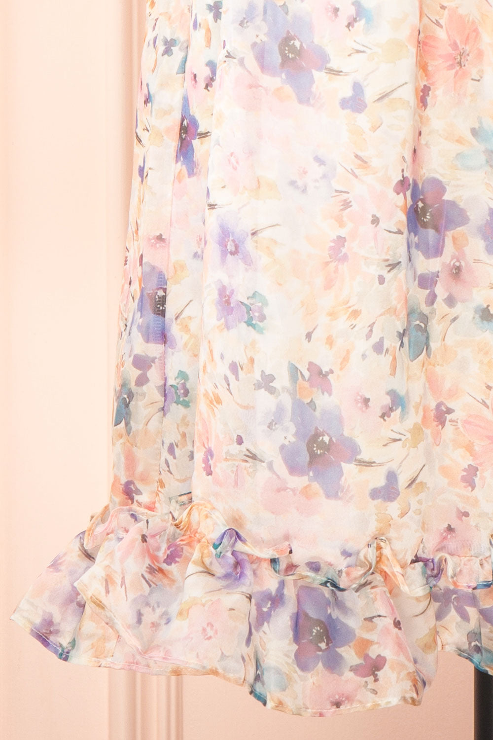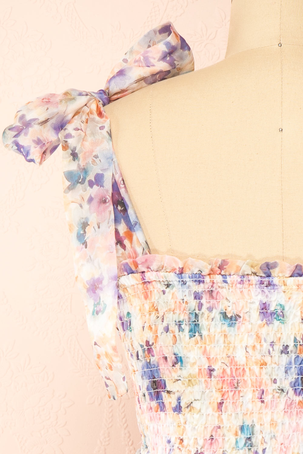 Step into the garden of dreams with this enchanting short floral dress! The soft colours of the floral print will transport you to a sunny meadow, while the silky chiffon fabric drapes elegantly across your body. The bow straps and ruched top add a touch of playful romance. The ruffles at the skirt hem create a whimsical touch that you would appreciate. Perfect for a summer afternoon stroll or a garden wedding, this dress is sure to make you feel like a flower in bloom!