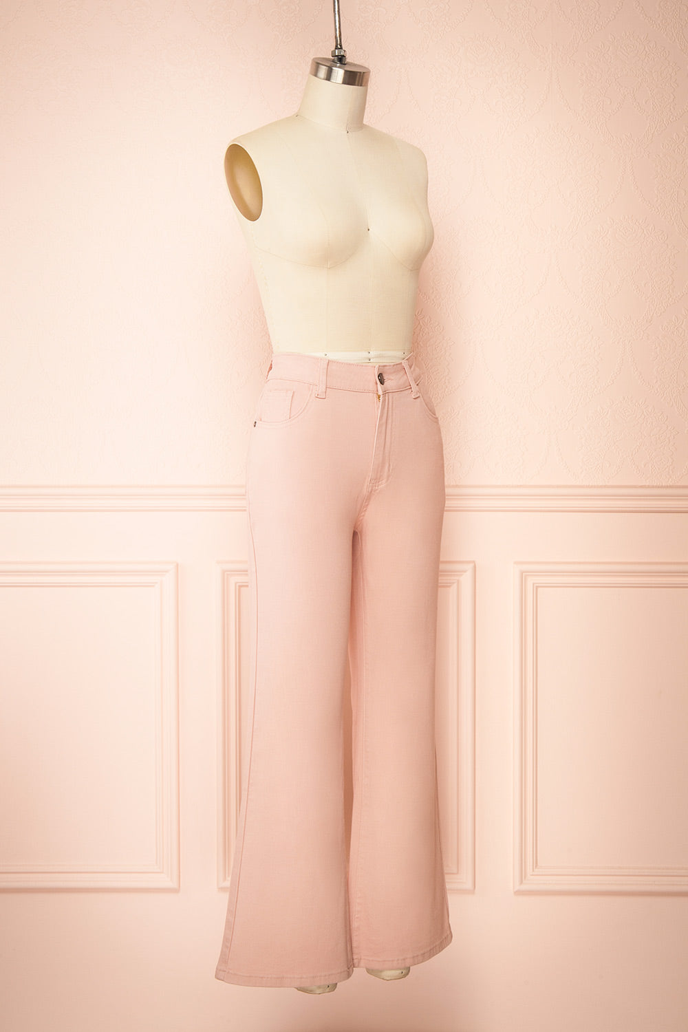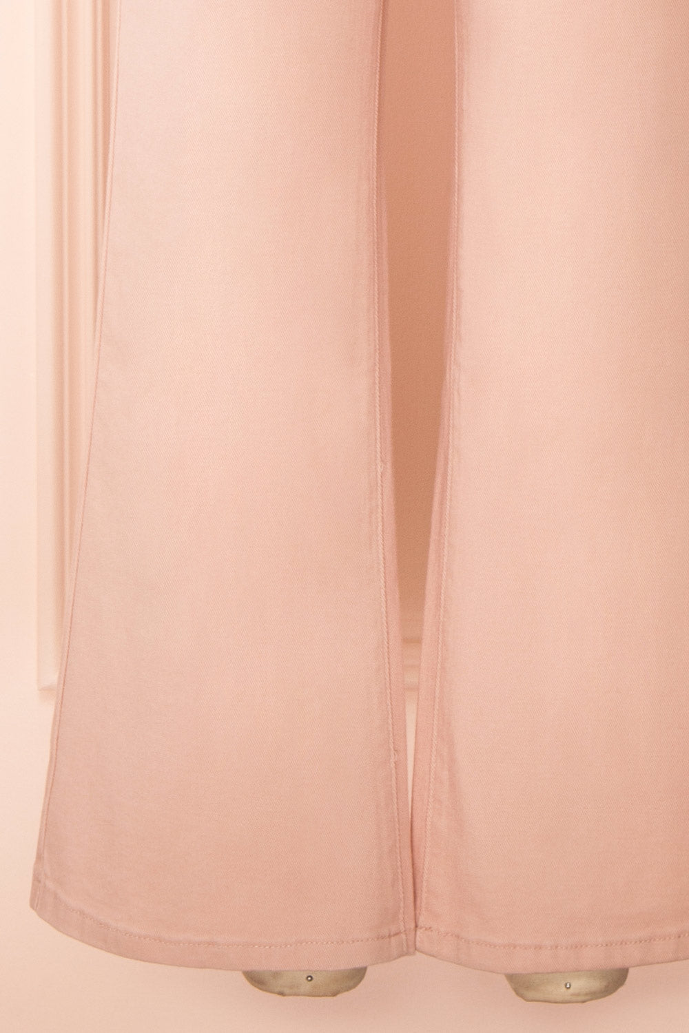 Embrace the sweet charm of spring with these high-waisted denim pants in a lovely pink hue, reminiscent of blooming flowers in a meadow. The flare legs add a touch of retro flair, perfect for dancing through sunlit streets. Pair with a crisp white top for a playful yet effortlessly chic ensemble that captures the essence of the season.