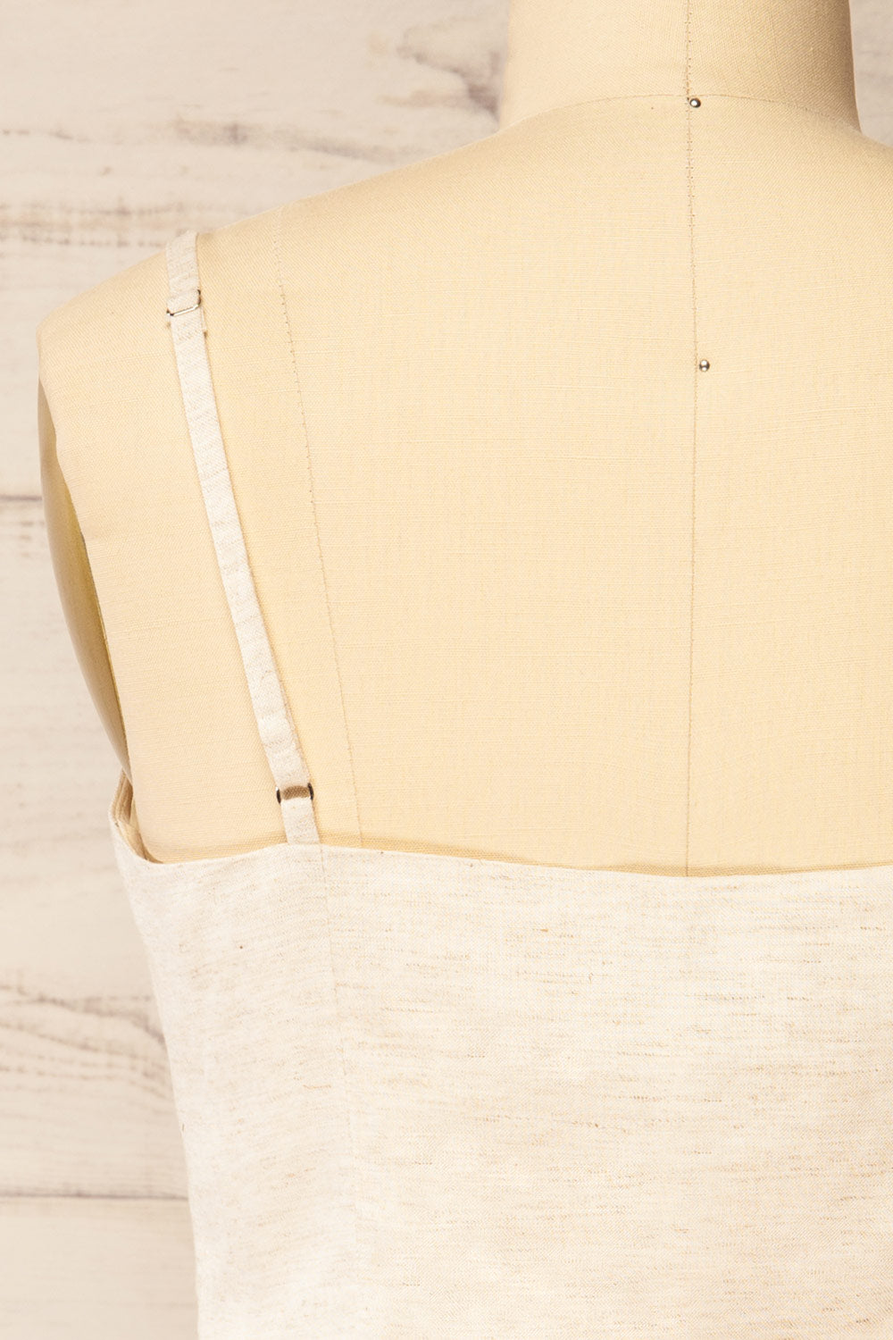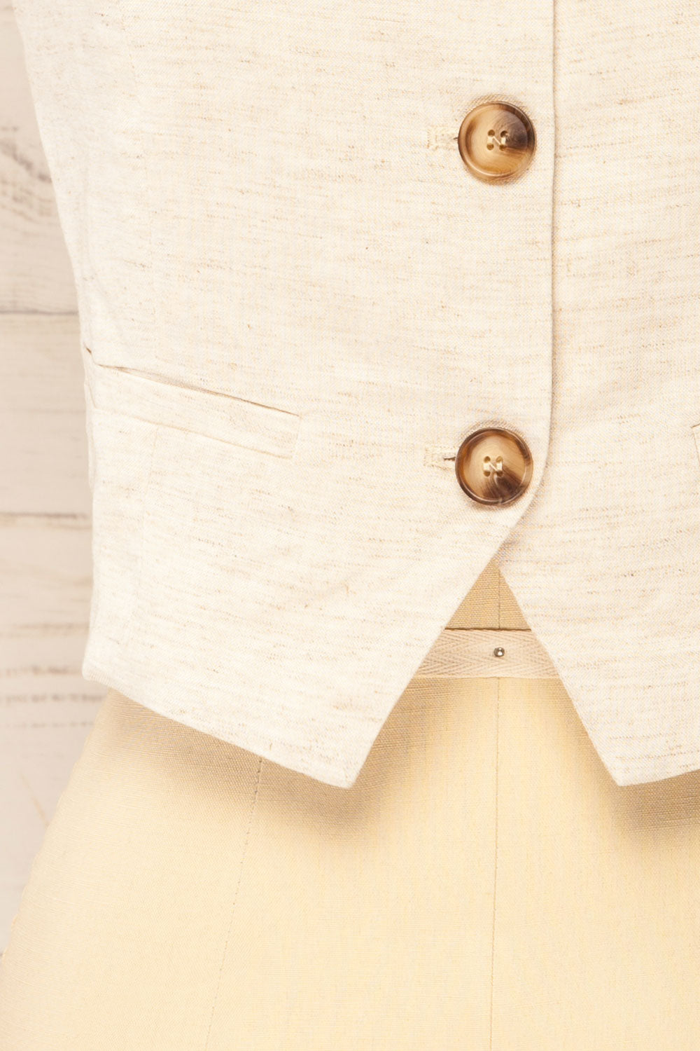 This timeless beige cropped vest top exudes sophistication and style with its three-button closure and classic fit. The sleek design is complemented by its square neckline and thin adjustable straps. Perfect for layering over a crisp button-down shirt or wearing as is, this versatile piece will effortlessly elevate any look!