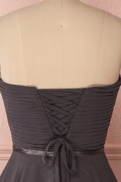 This beautiful airy chiffon dress is a dream come true! The lace-up back, corset with boning, inner adhesive band, and padded cups will ensure the perfect fit. A short satin lining will comfortably cover you, while the A-line cut is slightly longer in back for a trendy feel. Wear it with a statement necklace or simply with some flowers in your hair!