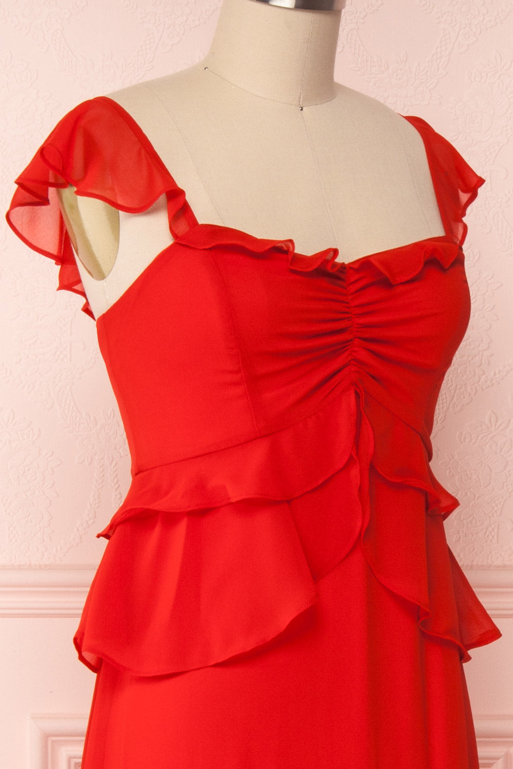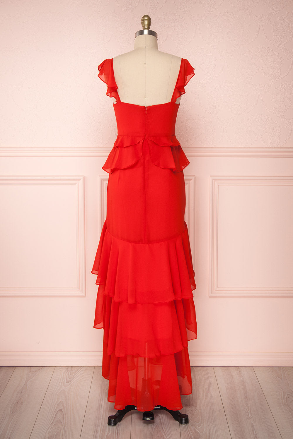 The festive spirit of this long dress will carry you in its wake! The flared cut is decorated with ruffles for a voluminous effect, and the lightweight material adds to the vaporous style of the piece. A soft stretch lining will be comfortable, and an invisible back zipper will let you slip it on with ease.