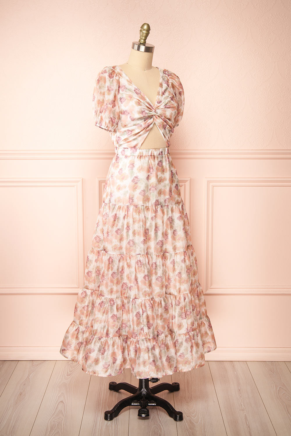 This lovely watercolour floral dress looks straight out of a fairytale! Its ruched bust, sweetheart neckline and middle cut-out will delicately reveal your skin. The flowy A-line midi skirt will add an elegant touch to your outfit and fall gracefully against your figure. You'll love the detail of its ruffles and short puffy sleeves that give it a romantic charm!
