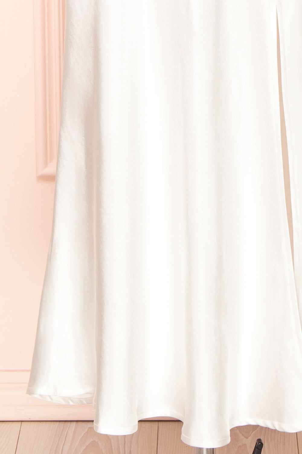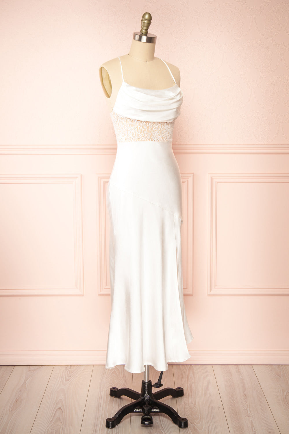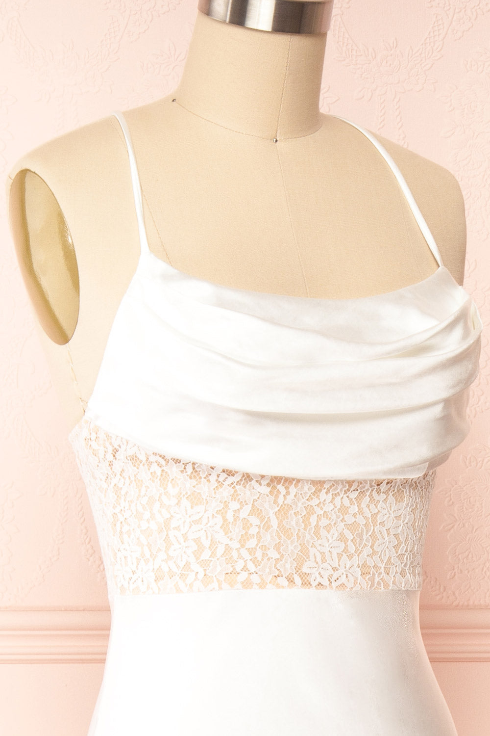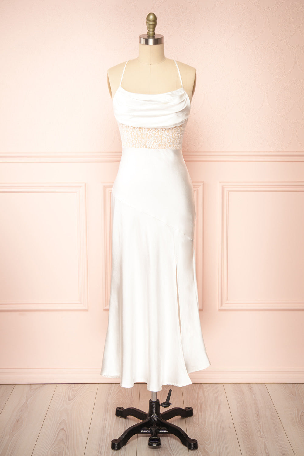 This satin dress will make you the star of the evening! Its cowl neckline and lace top, complemented by its elegant and minimalist allure, will give you a chic look for any occasion. You will appreciate its smooth and comfortable fabric which will hug your curves beautifully as well as the lace-up open back and front slit which will reveal your skin in an alluring way.