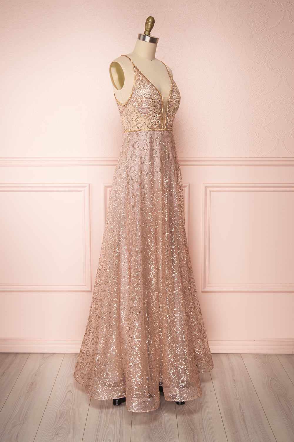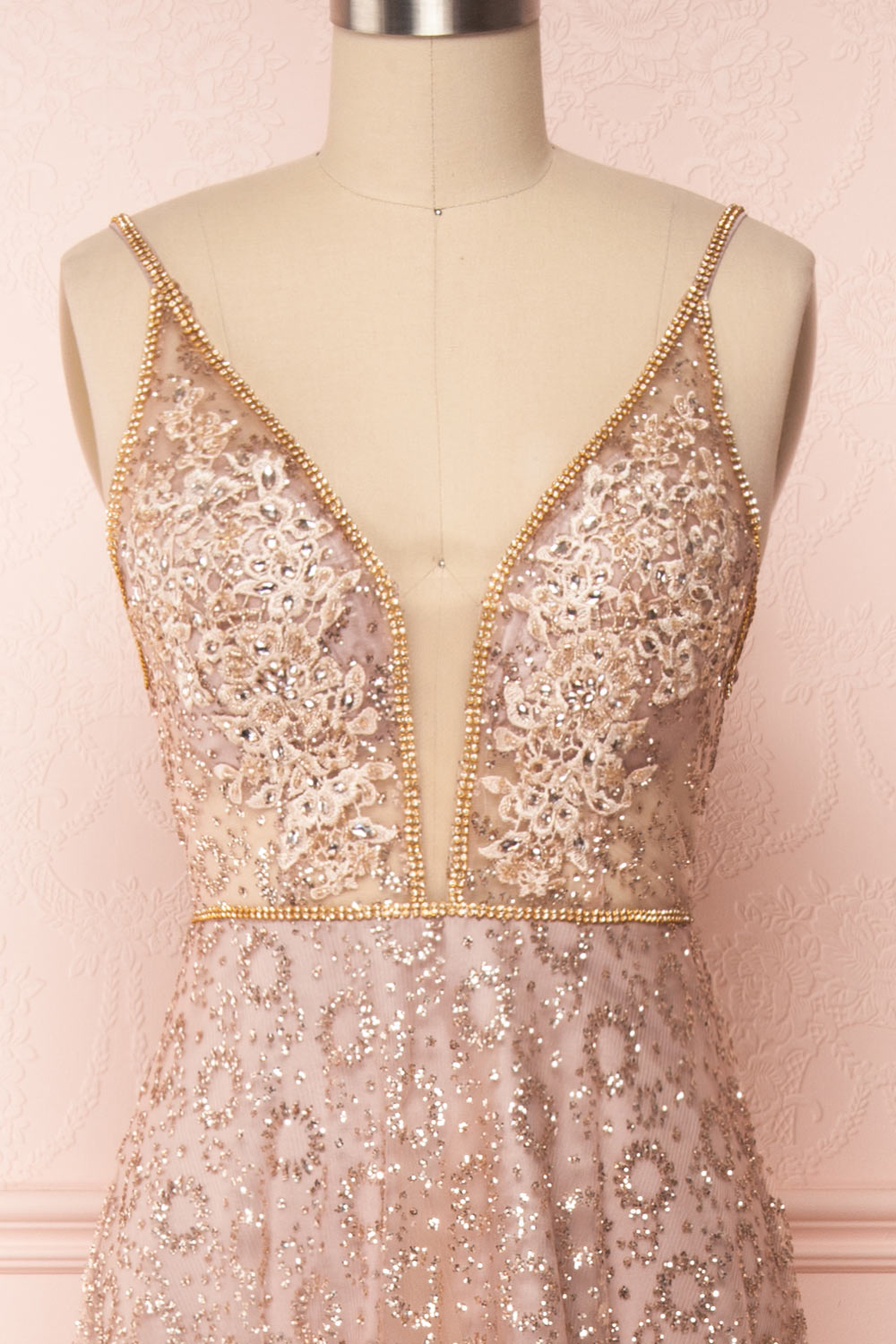 This sumptuous sparkly dress will make your admirers breathless! The A-line cut and the fitted bodice will enhance your figure. The plunging neckline and lace bust decorated with sparkling crystals will reveal your skin, while the cups will offer you the necessary support and coverage. The back zipper will hold everything in place. A satin lining will keep you comfortable.