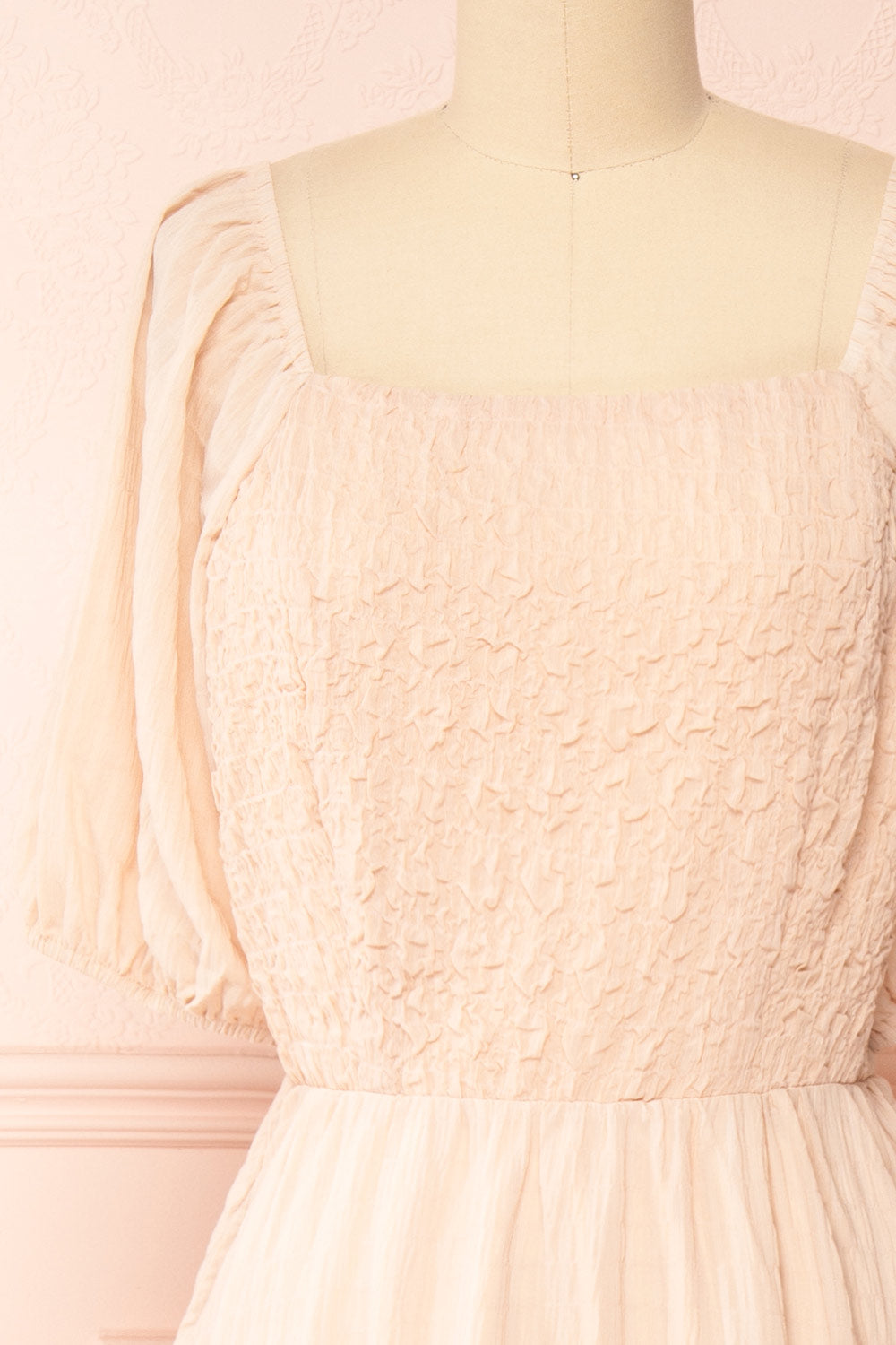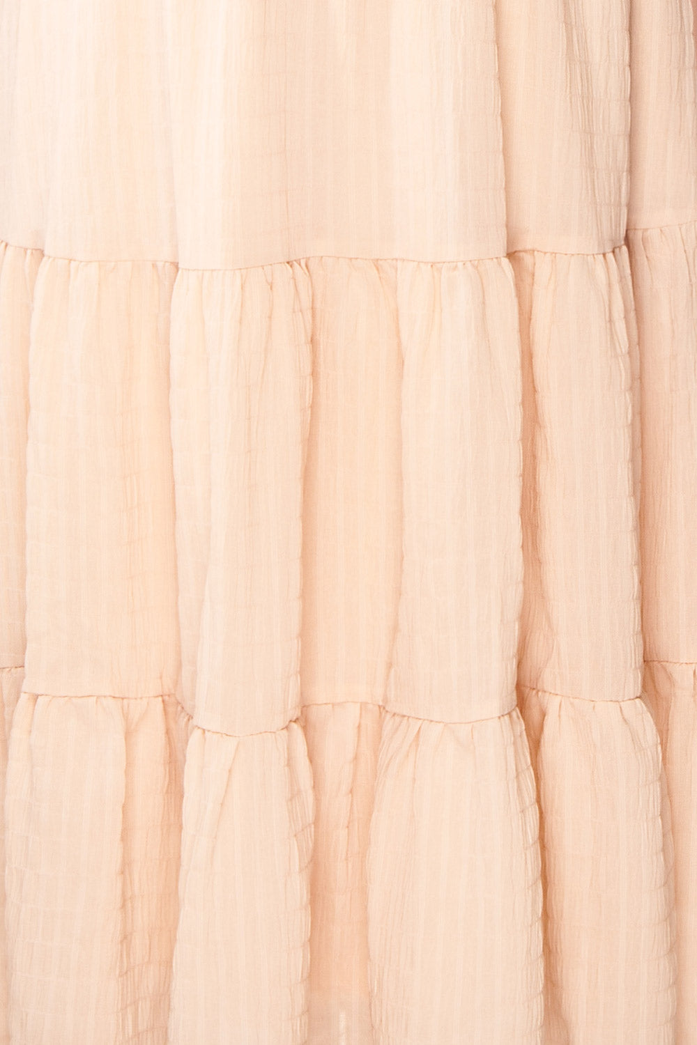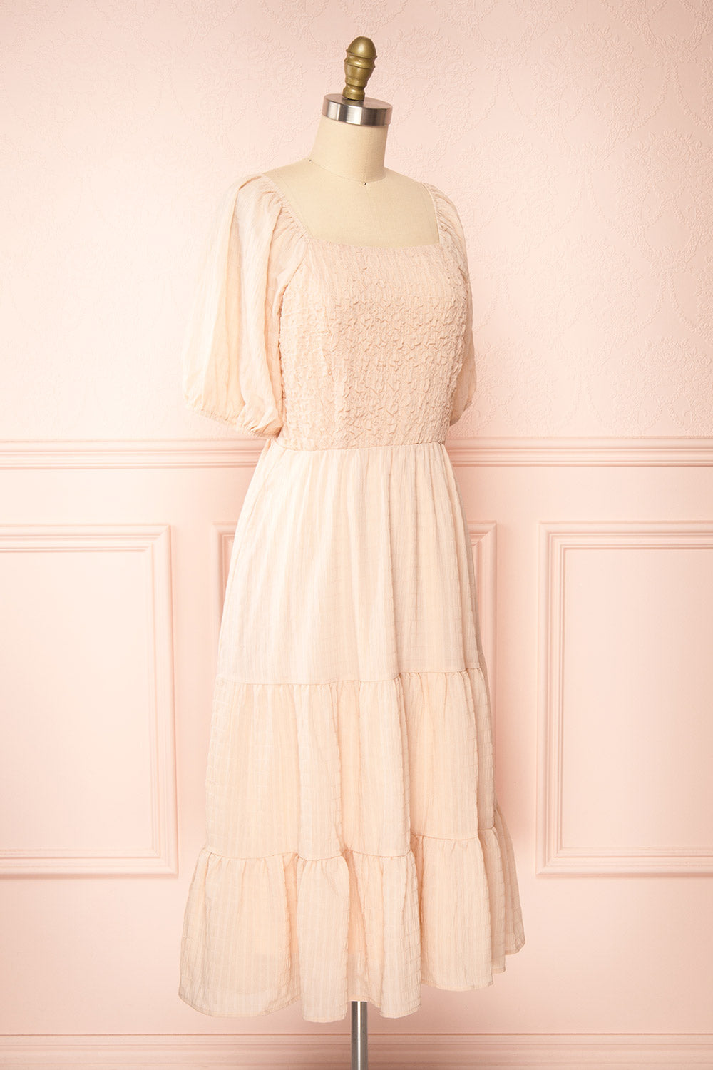 Let yourself be enchanted by this lovely tiered midi dress! Its textured fabric gives it an undeniable charm while its short puffy sleeves and square neckline will add a feminine touch to your outfit. Pair it with a straw hat and sandals for an outfit perfect for the season!