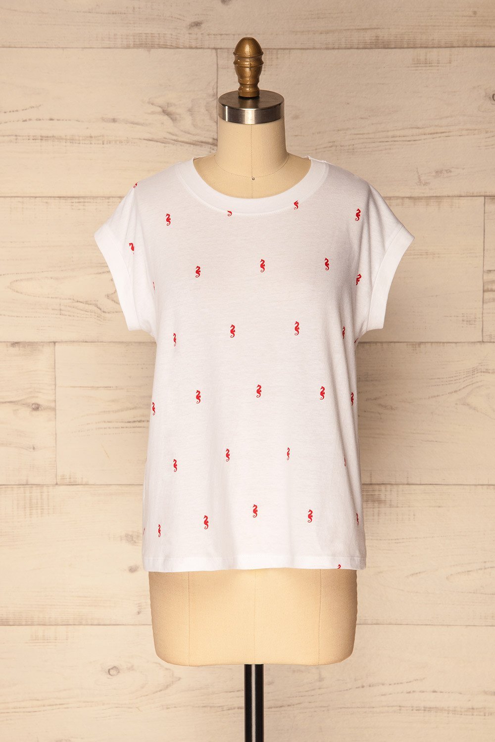 The little red seahorses on this white t-shirt will make you want to escape to the sea! The loose fitting cut and light fabric will be perfect for says under the sun, all you need to do is pick your favourite shorts and wide brimmed hat!