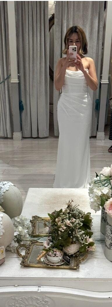 This strapless fitted dress is made from an airy chiffon fabric, featuring a scoop neckline and a delicately gathered bodice for a soft, romantic look. The structured design with a lace-up corset back ensures a secure and flattering fit. Perfect for a rehearsal dinner, engagement party, or destination wedding, this gown blends effortless elegance with timeless charm.