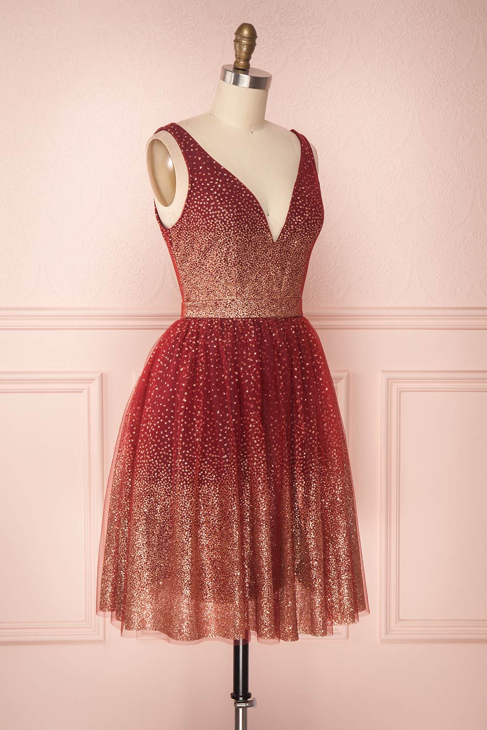 Celebrate! This tulle dress sprinkled in fairy dust offers a pretty golden shimmer overlayed with delicate mesh. Its plunging neckline and voluminous skirt will instantly put you in the festive mood!