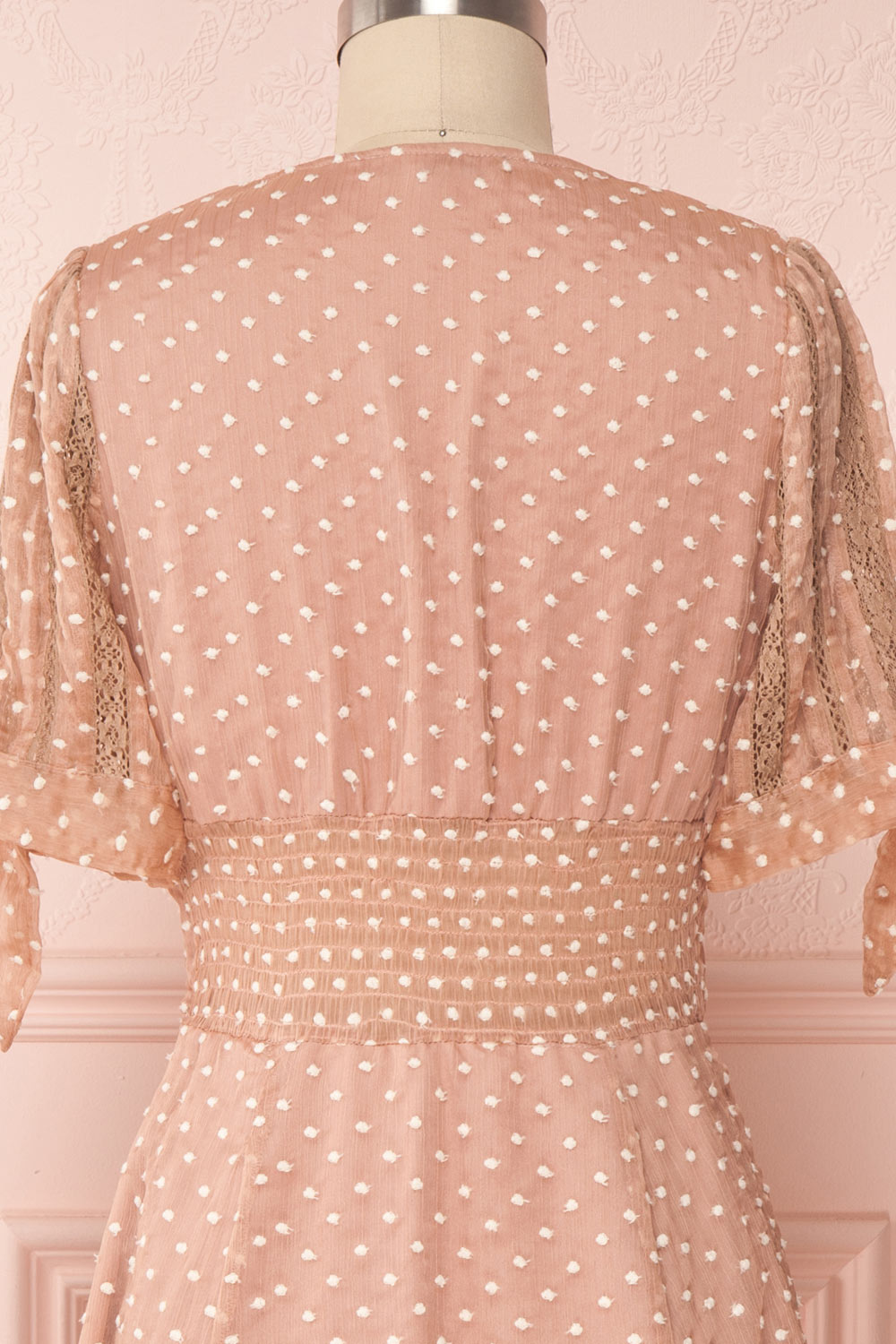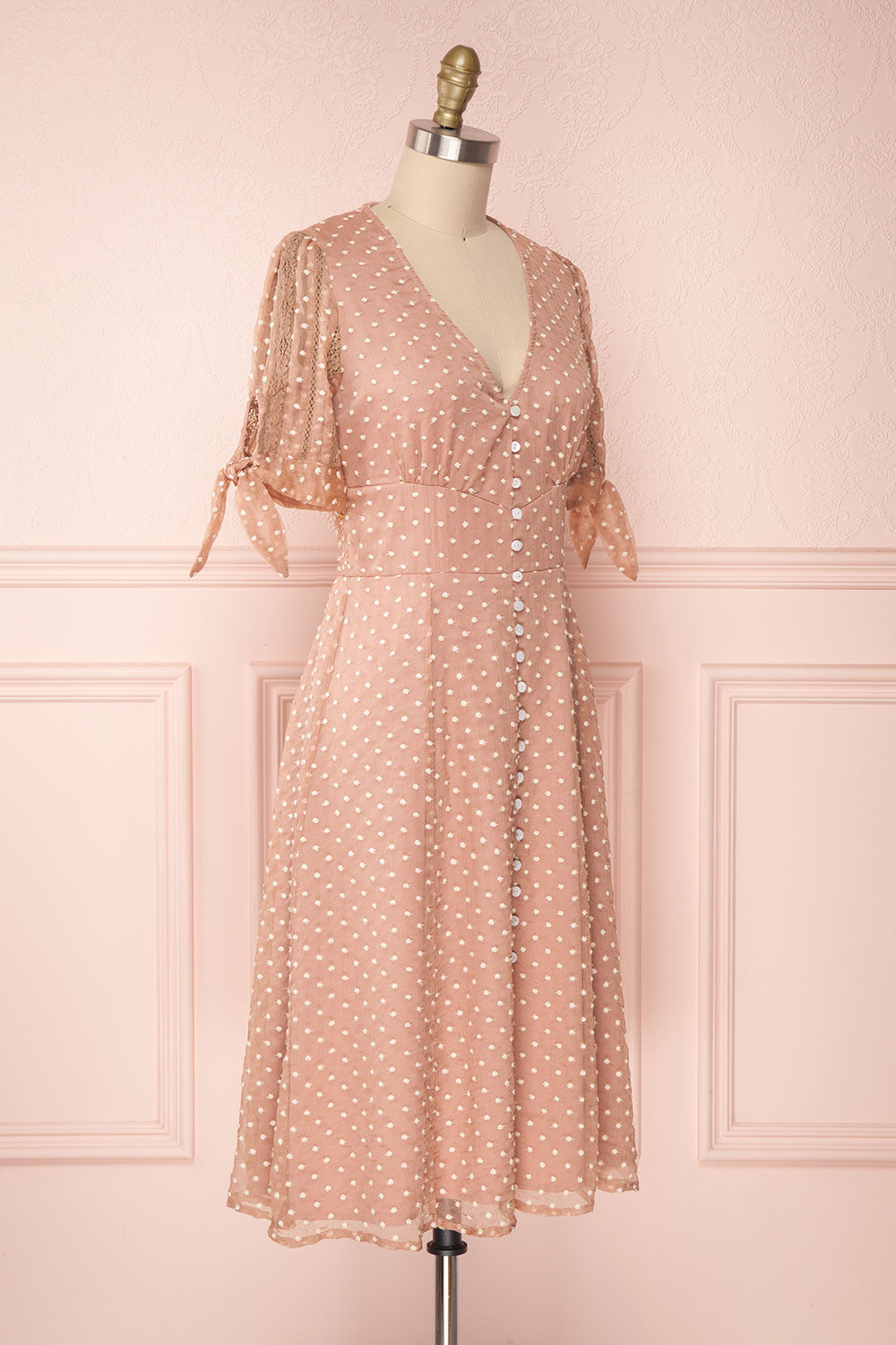 This coquettish dress will add an adorable touch to your wardrobe! Its flattering A-line cut will prove comfortable thanks to its elastic waist in back as well as its smooth lining. The knotted sleeves decorated with lace and buttons add charm to the dress. Wear it with ballet flats and a little leather handbag for a pretty outfit!