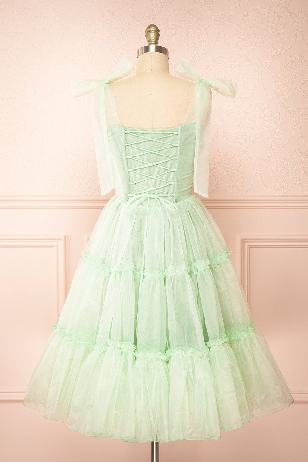 We present to you the most twirl-able dress you'll ever own! Made by Wild Rose & Sparrow with a petticoat silhouette in mind, this piece features a three-tier skirt in a sage tulle. The sleeves are ribbon closures that tie into bows on either shoulder. The corset back and boning will highlight your pretty silhouette, making sure you enjoy your night in the most fashionable way.