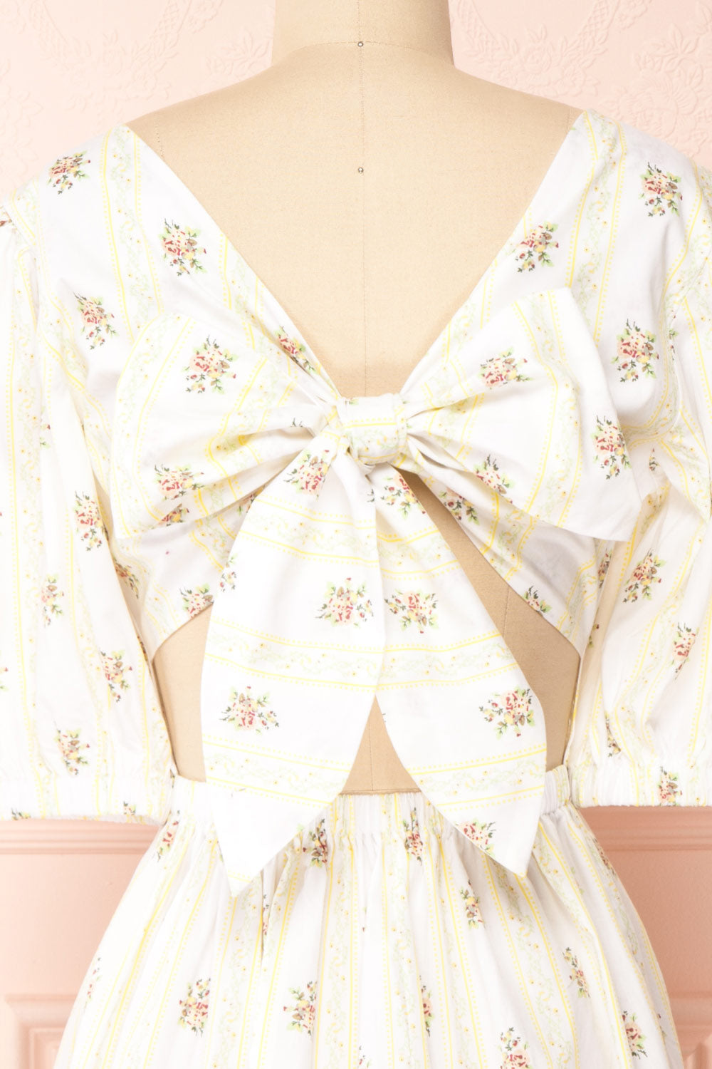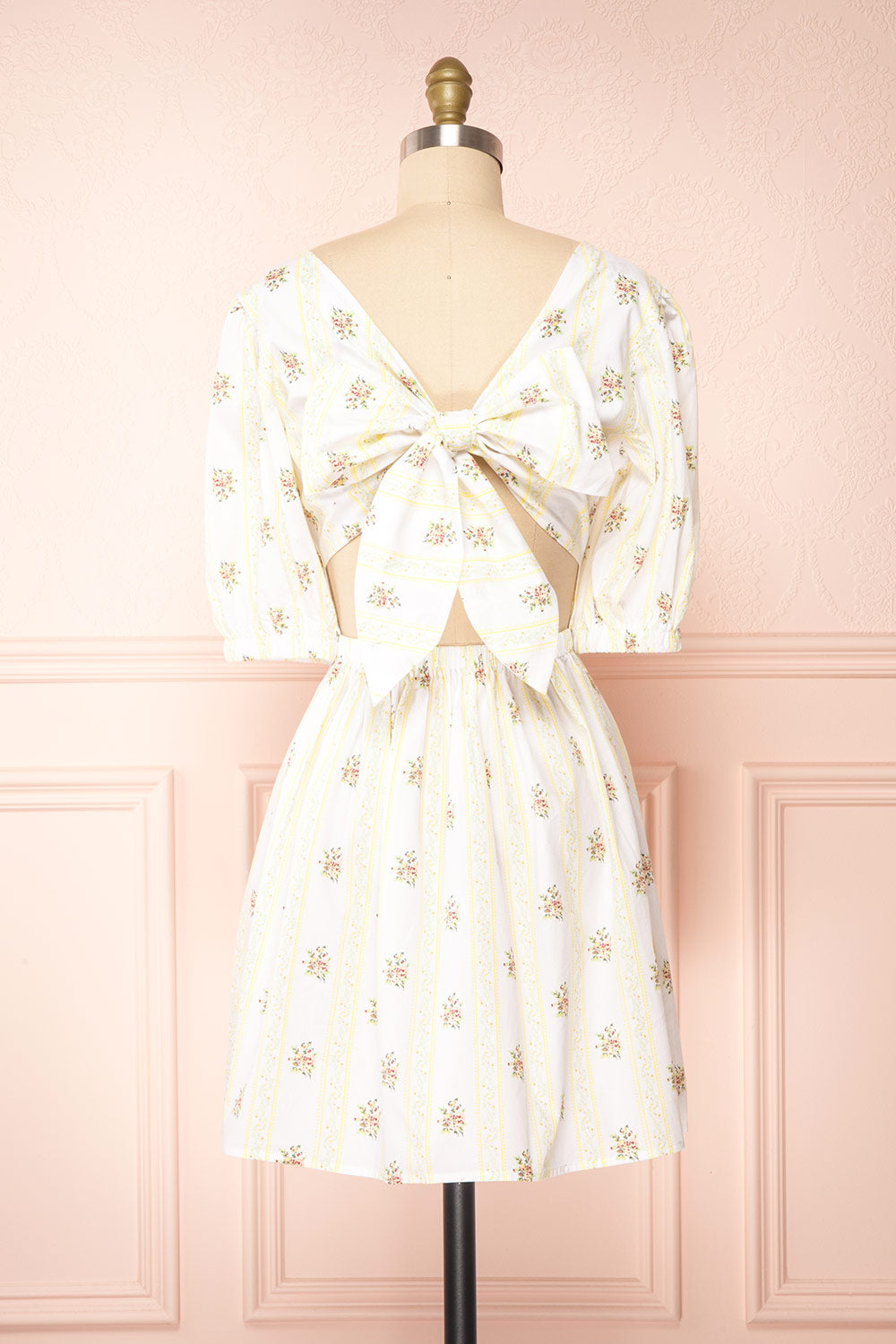 This lovely short dress will freshen up your spring wardrobe! You will love its lightweight cotton fabric complimented by its floral print for the way they'll mark the arrival of the new season. Its plunging neckline and its puffy half-sleeves with frame your bust nicely while its knotted bow at the open back will seal everything together in a cute way. Its buttons will allow you to put the piece on easily.